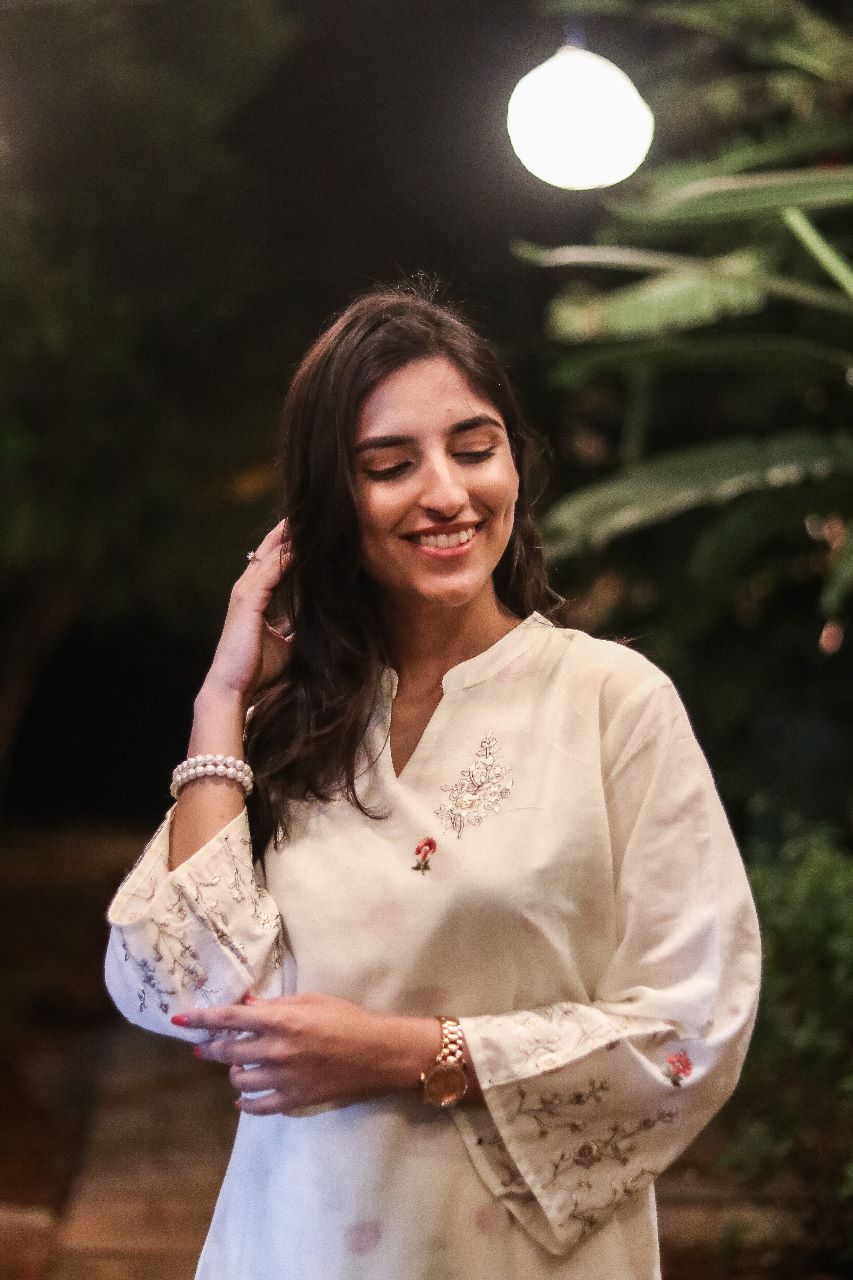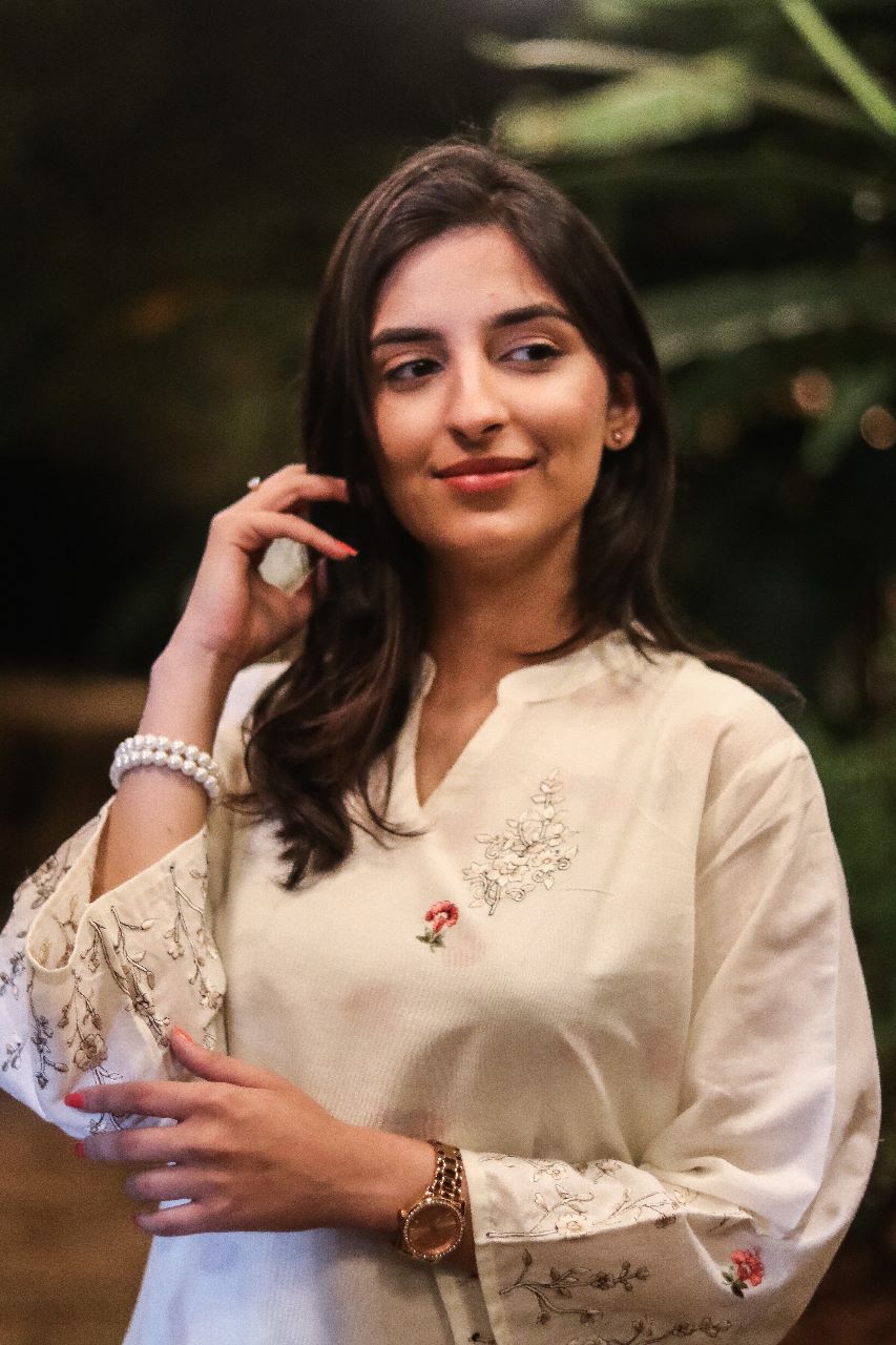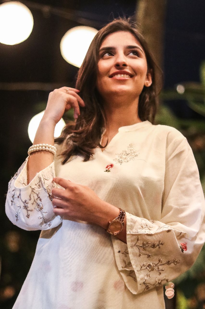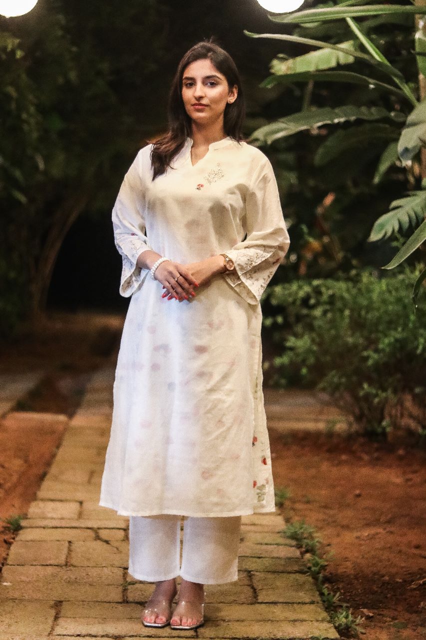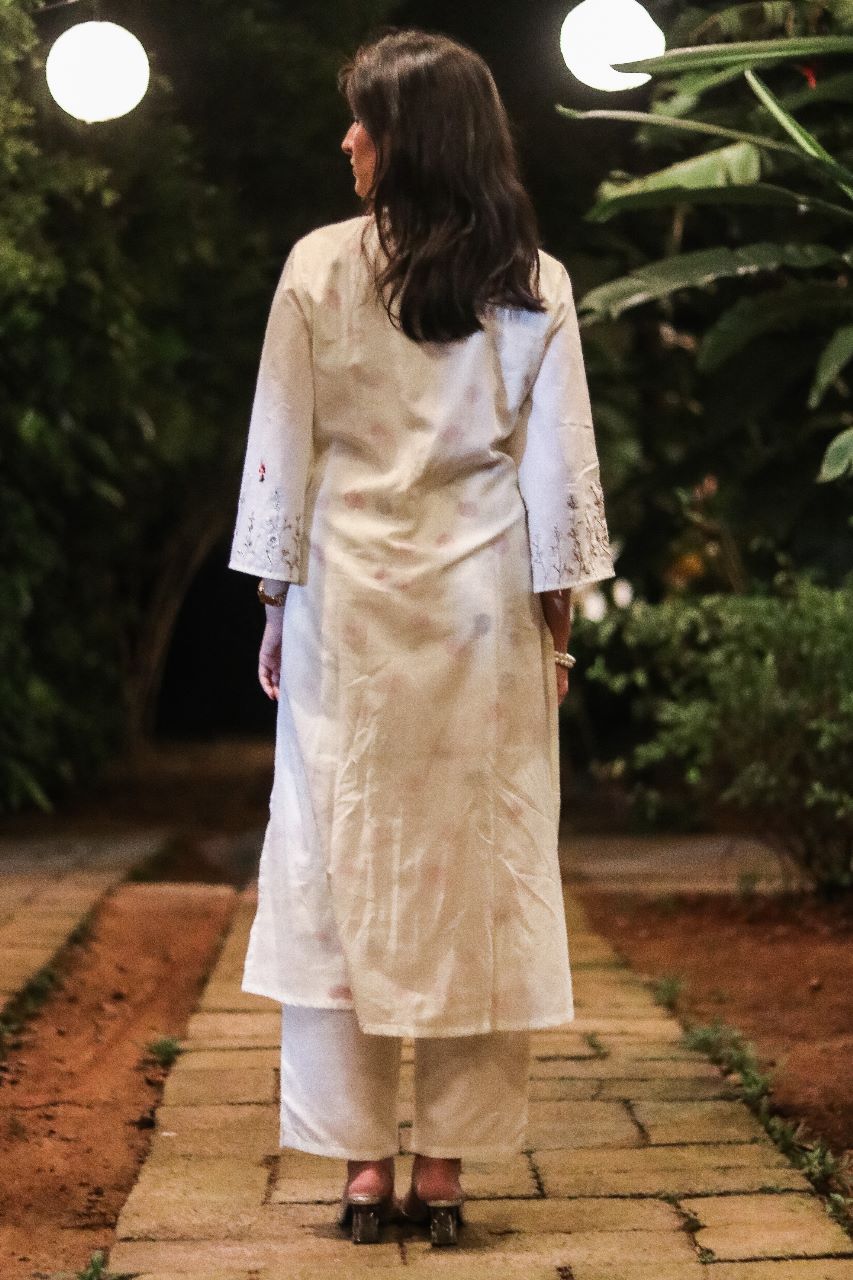 If you have a simple and elegant dress sense, then this suit-set is for you. Fabricated in cotton, the cream kurta and pants make a peaceful pair. The machine embroidery on the sleeves of the kurta and the floral work on the inner are exquisite.