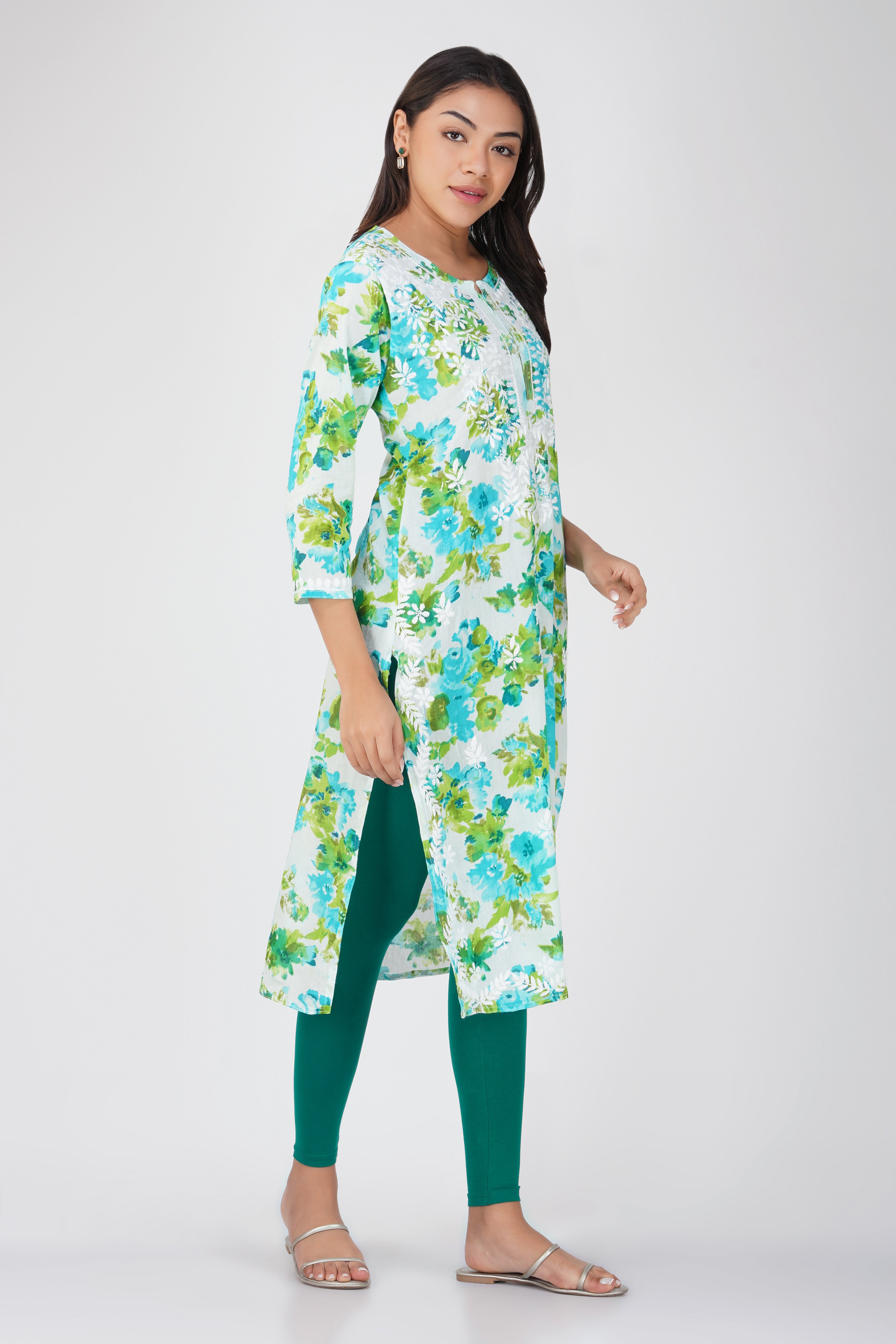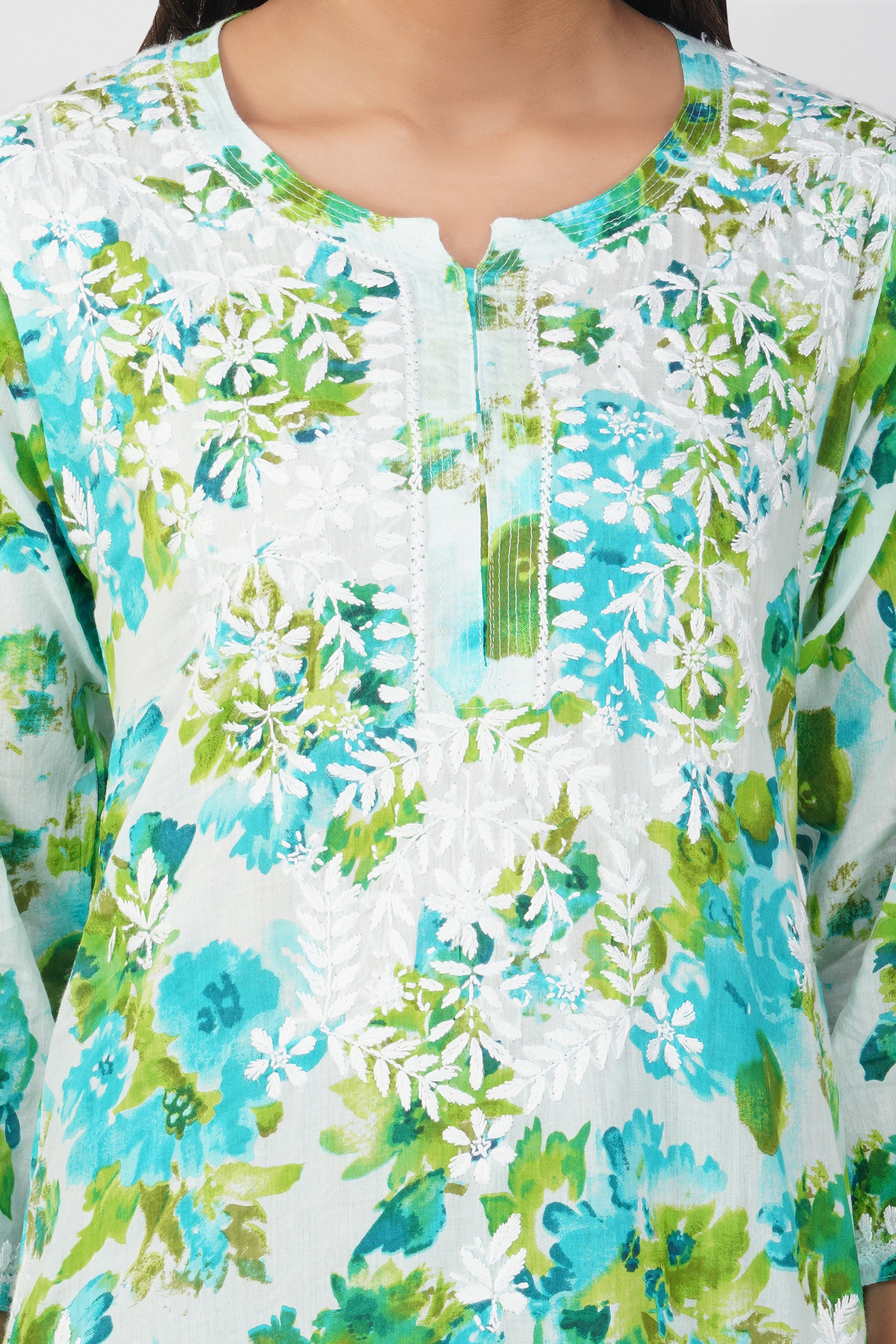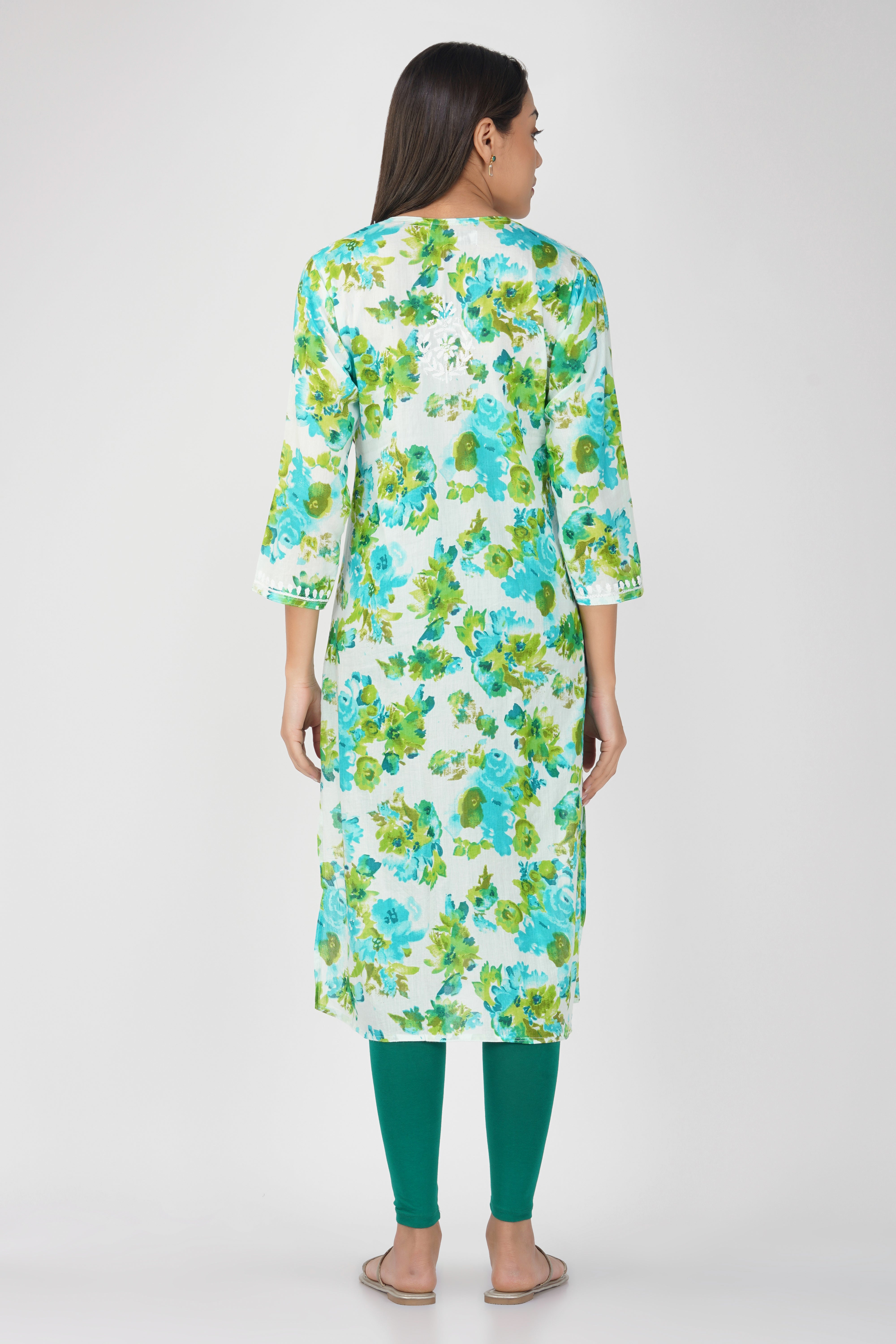 Flowery Green Cotton Kurti with White Chikankari Embroidery