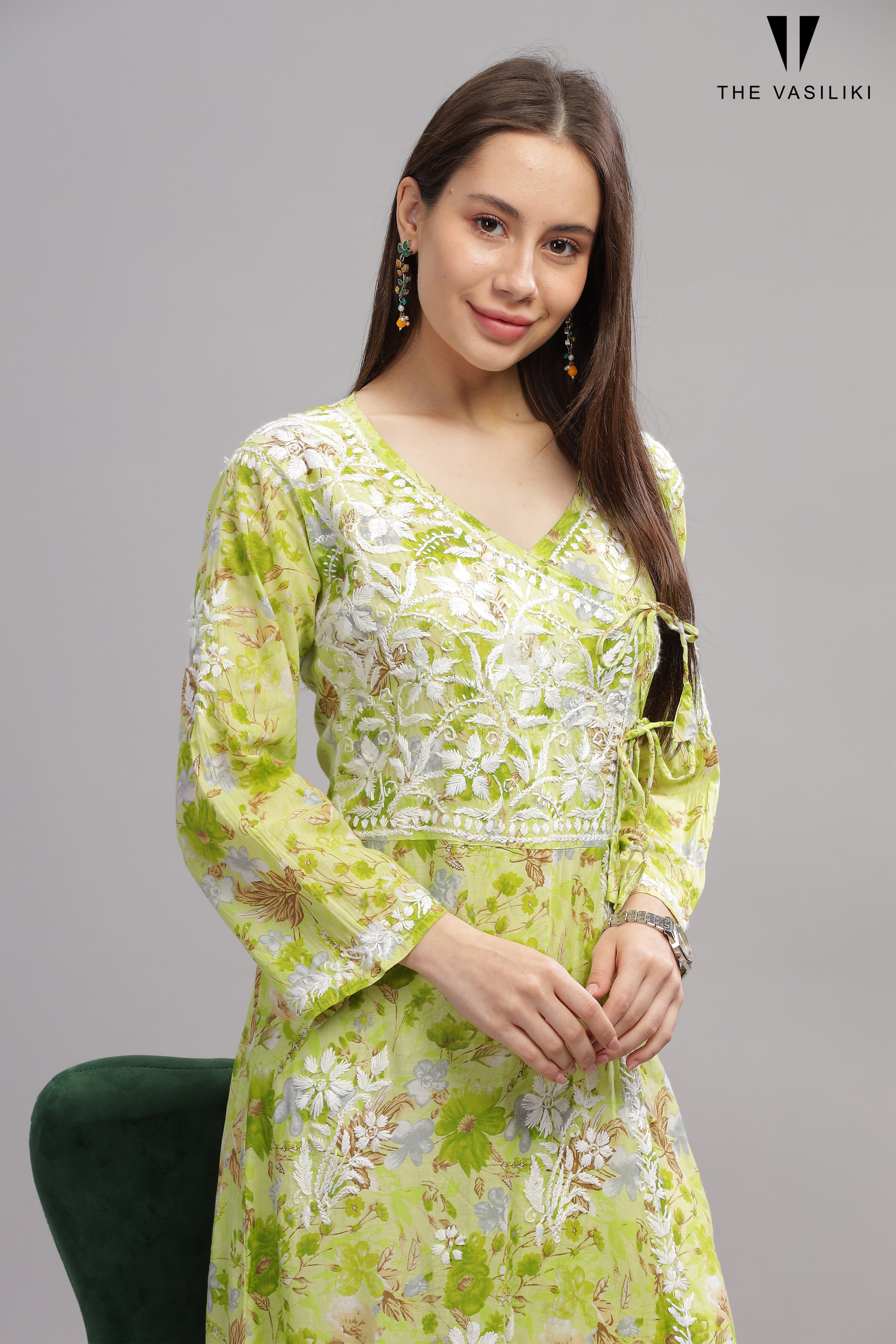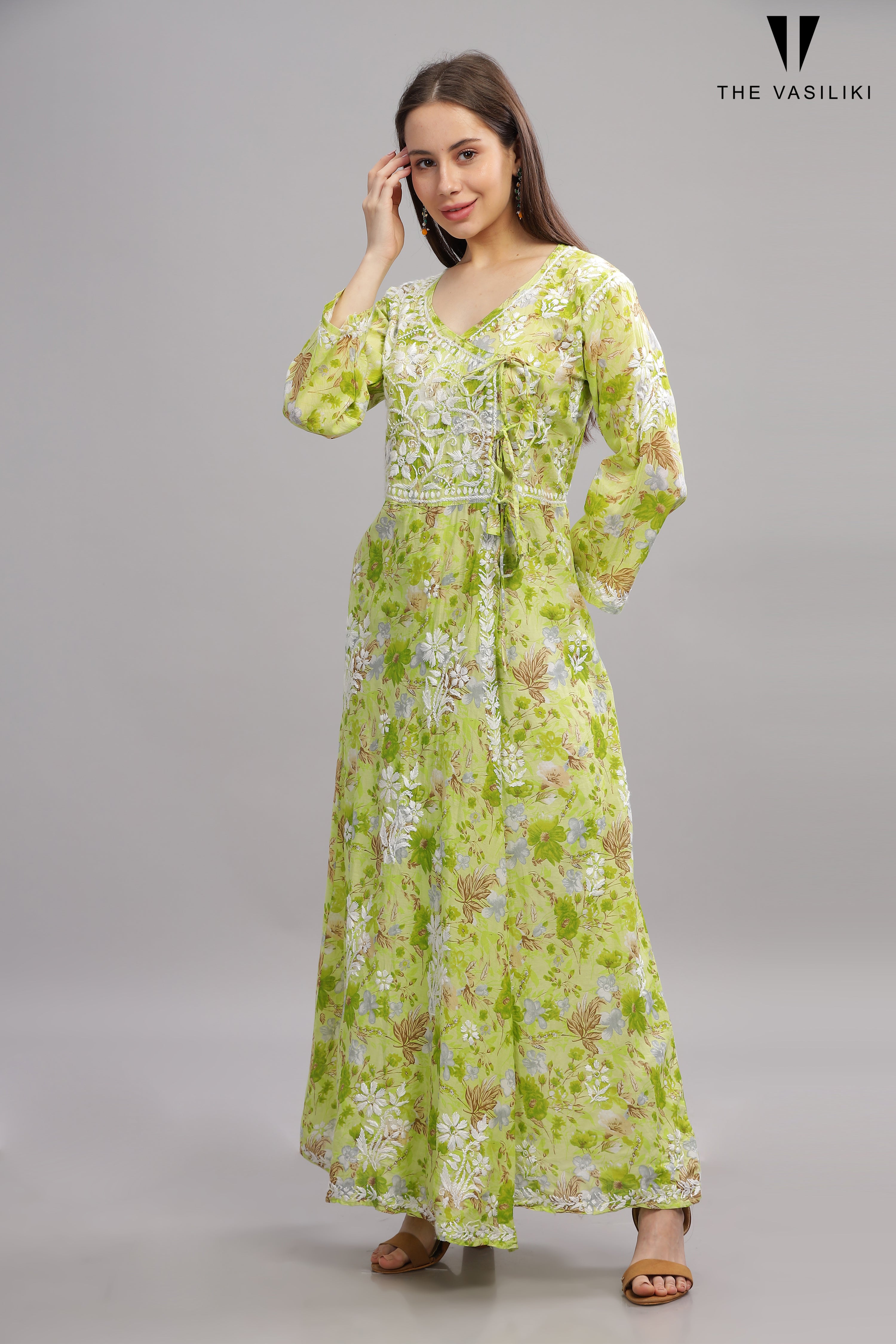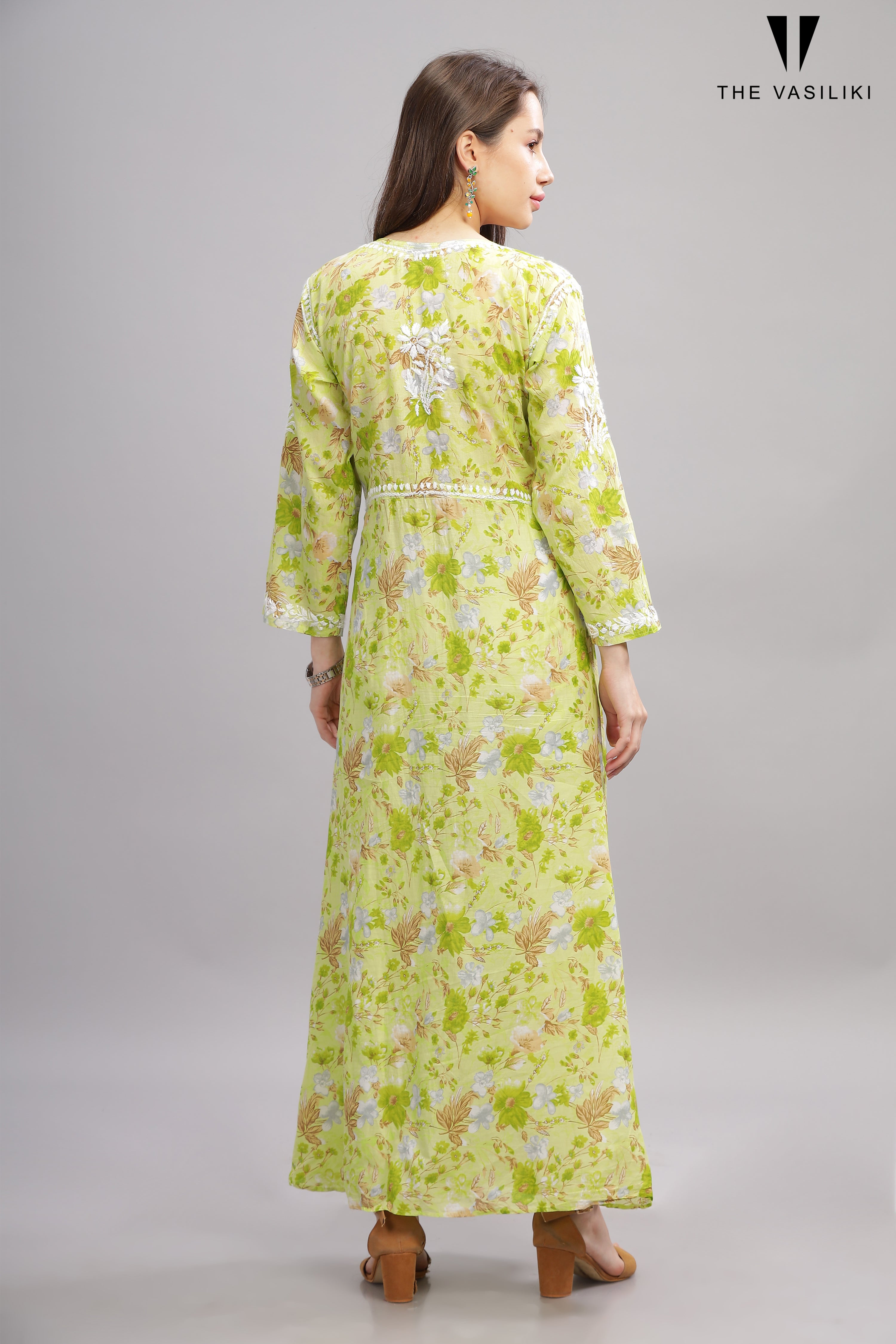 Flowery Green Mulmul Cotton Anarkali Gown with White Chikankari Embroidery