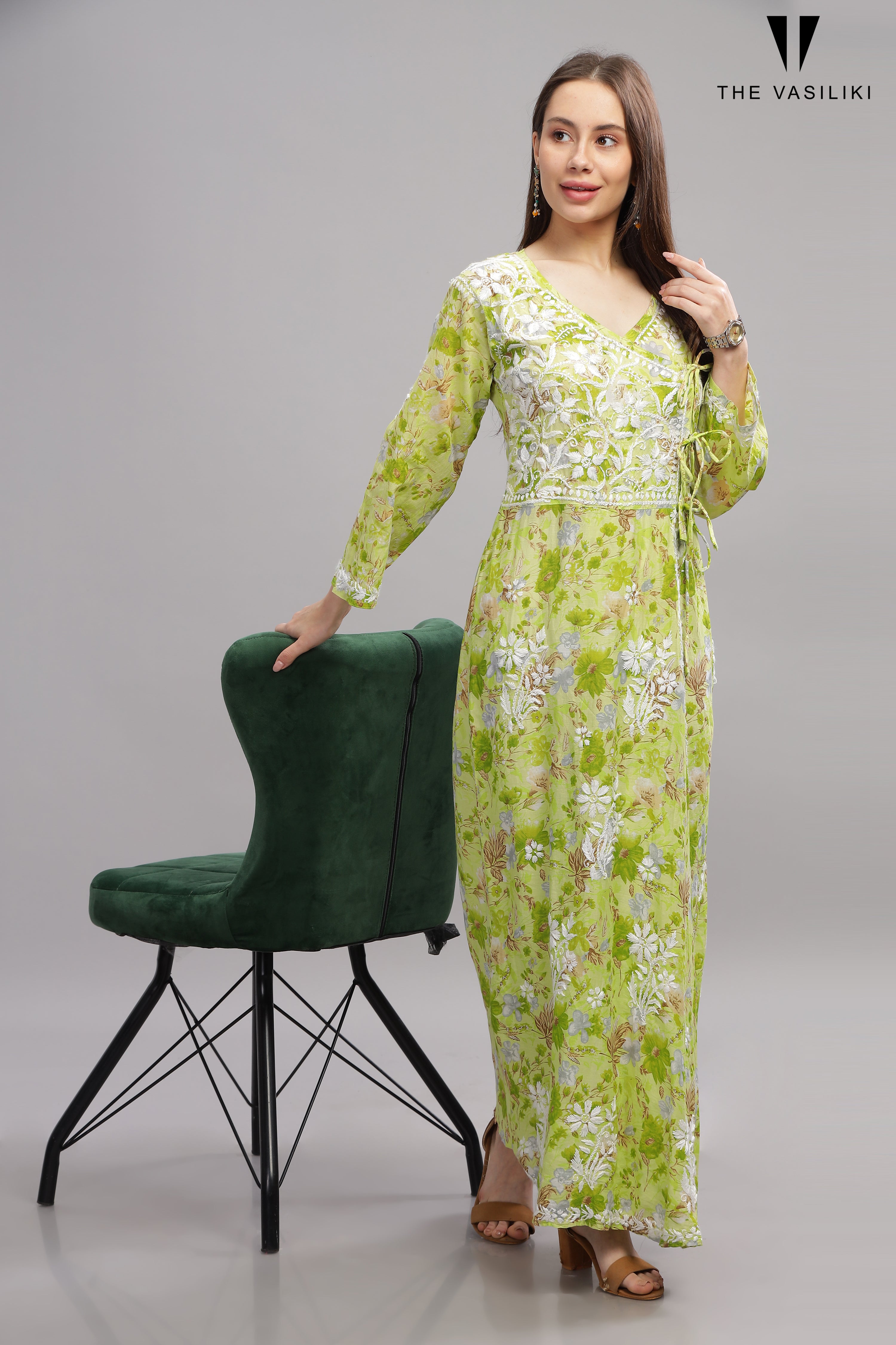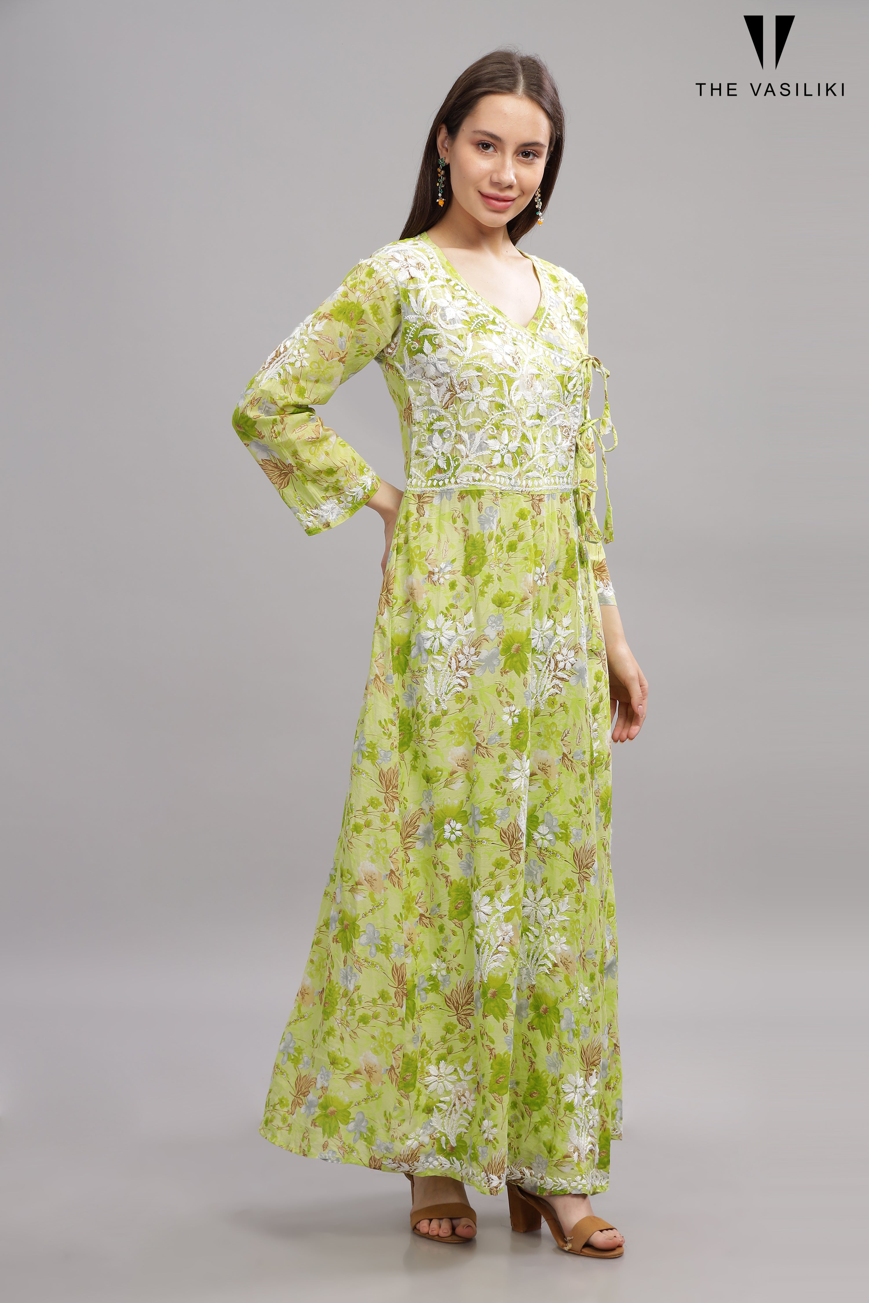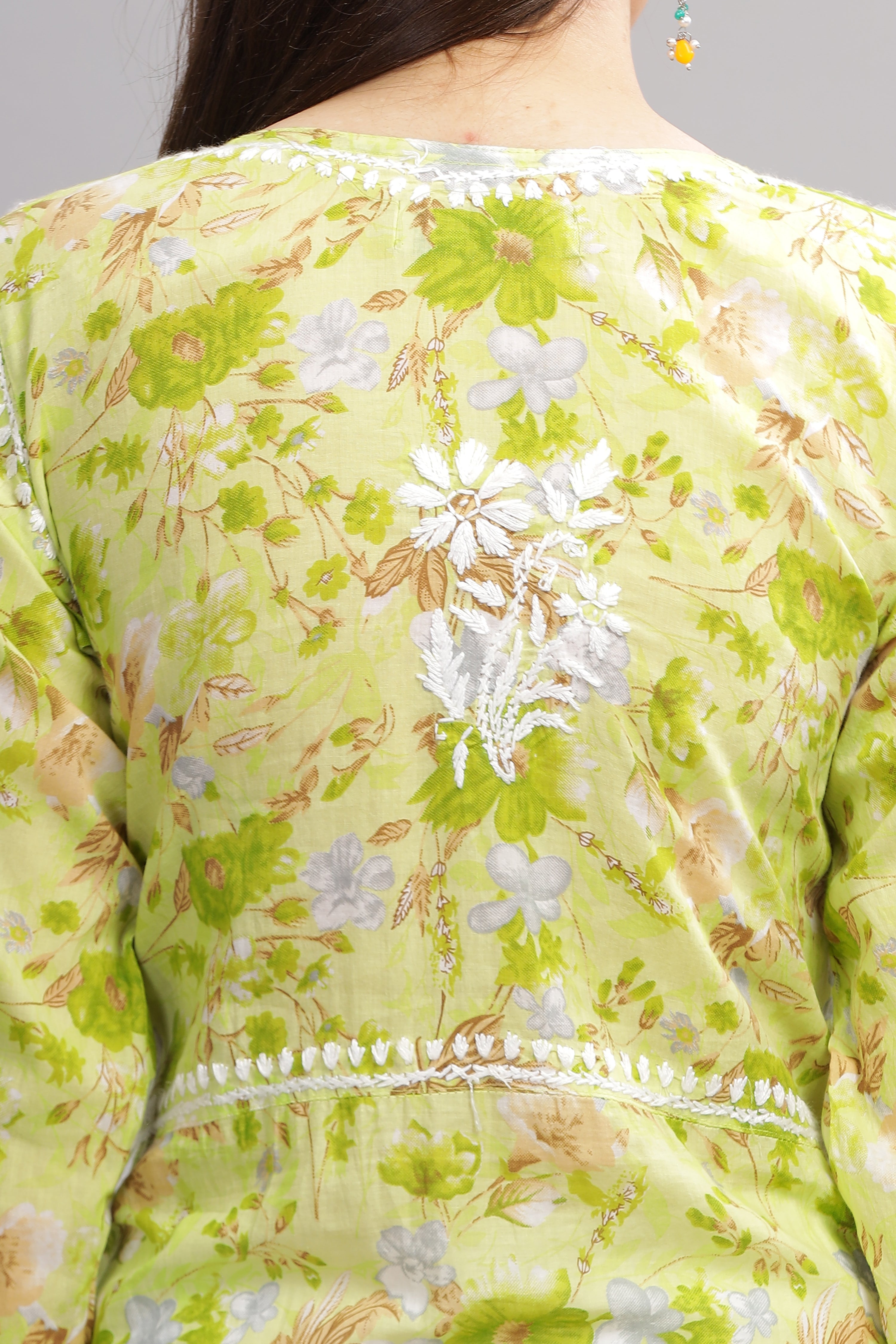 Flowery Green Mulmul Cotton Anarkali Gown with White Chikankari Embroidery