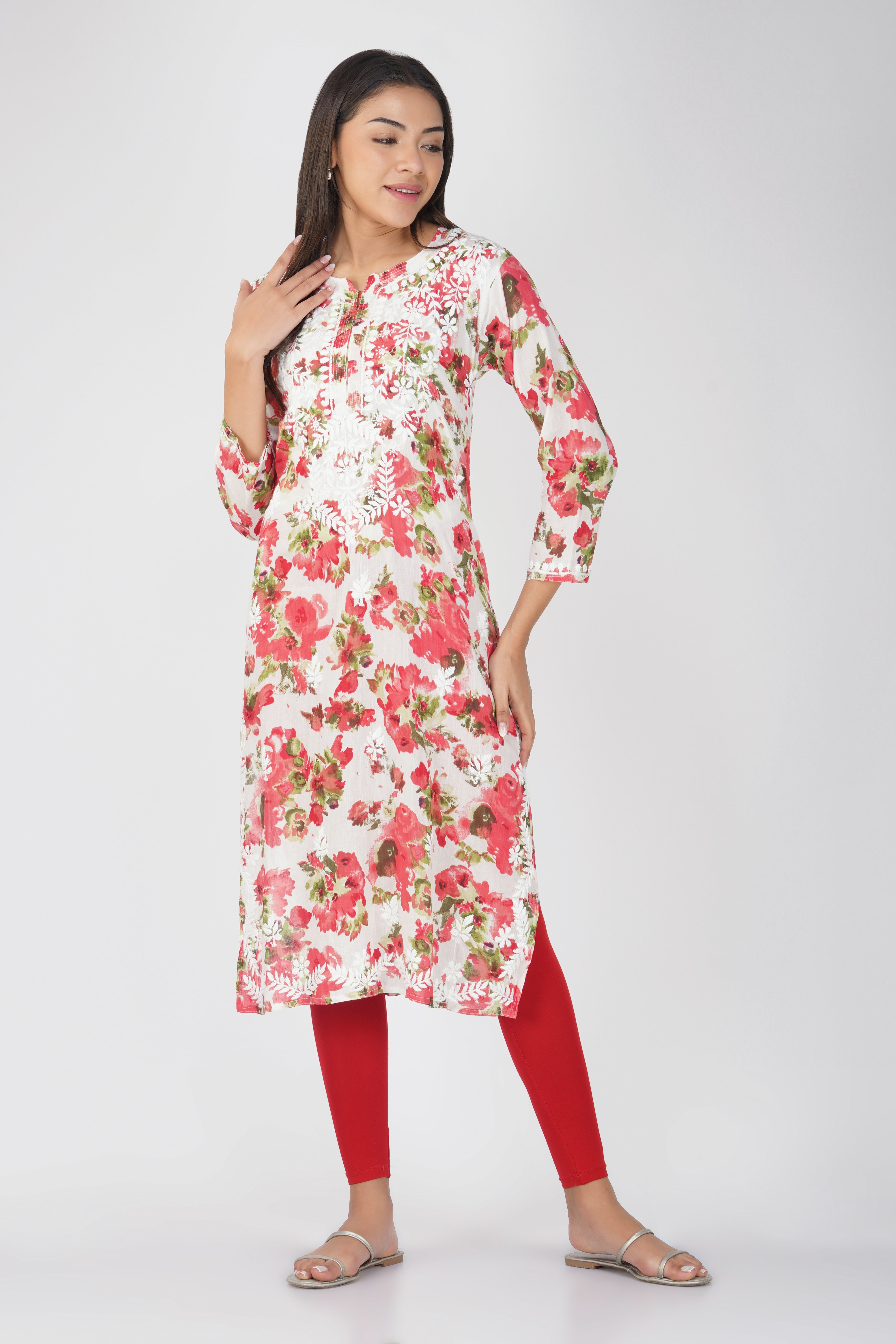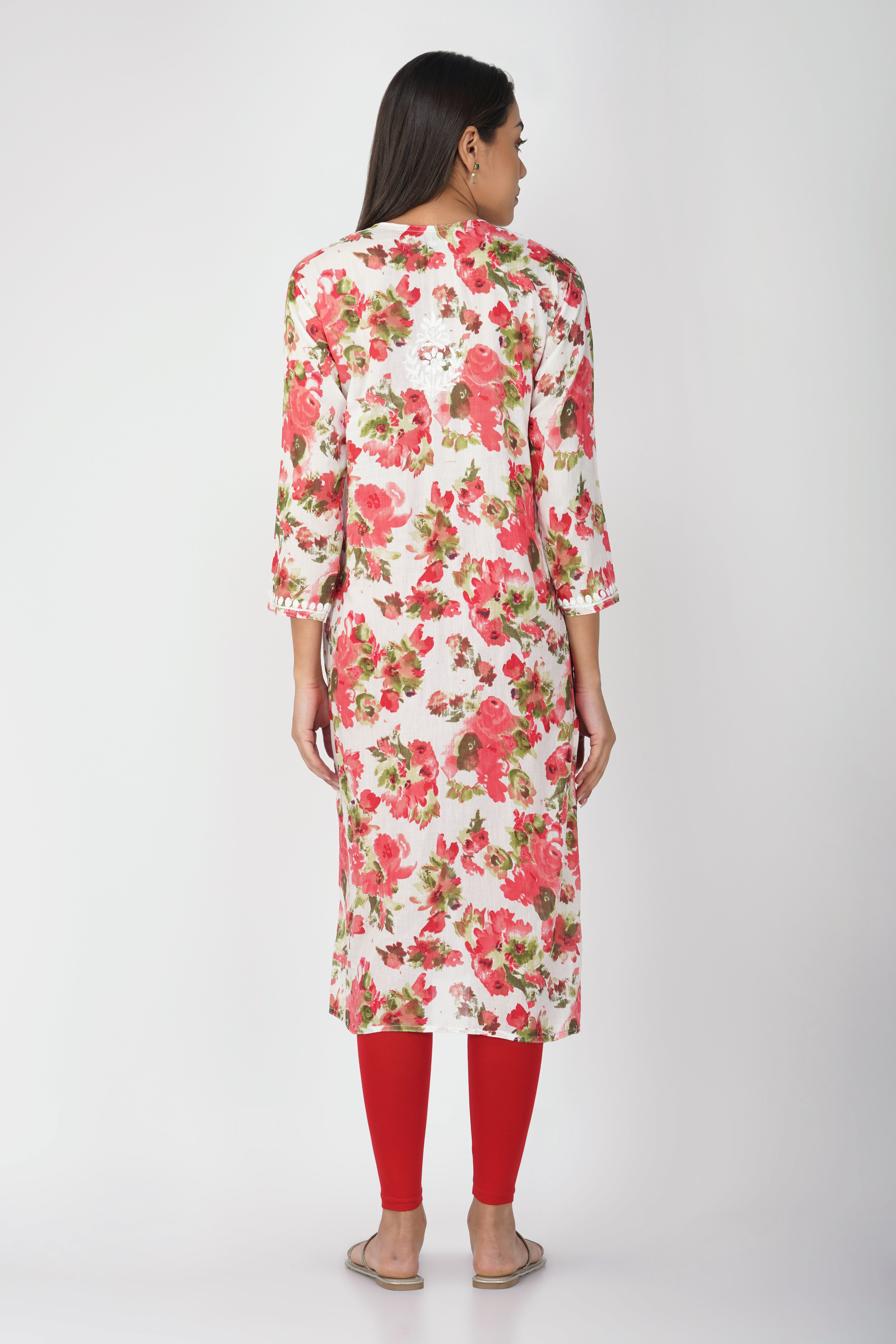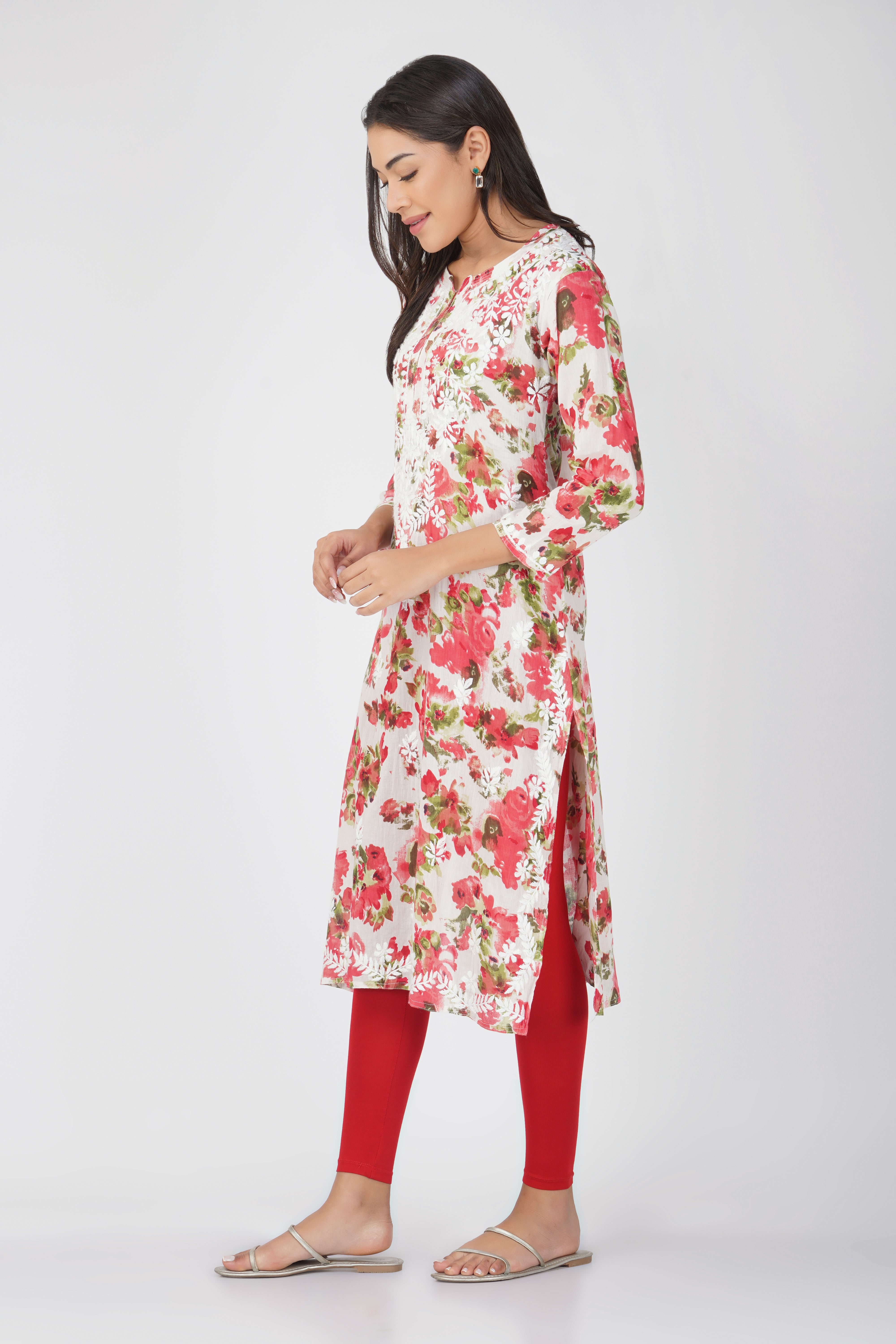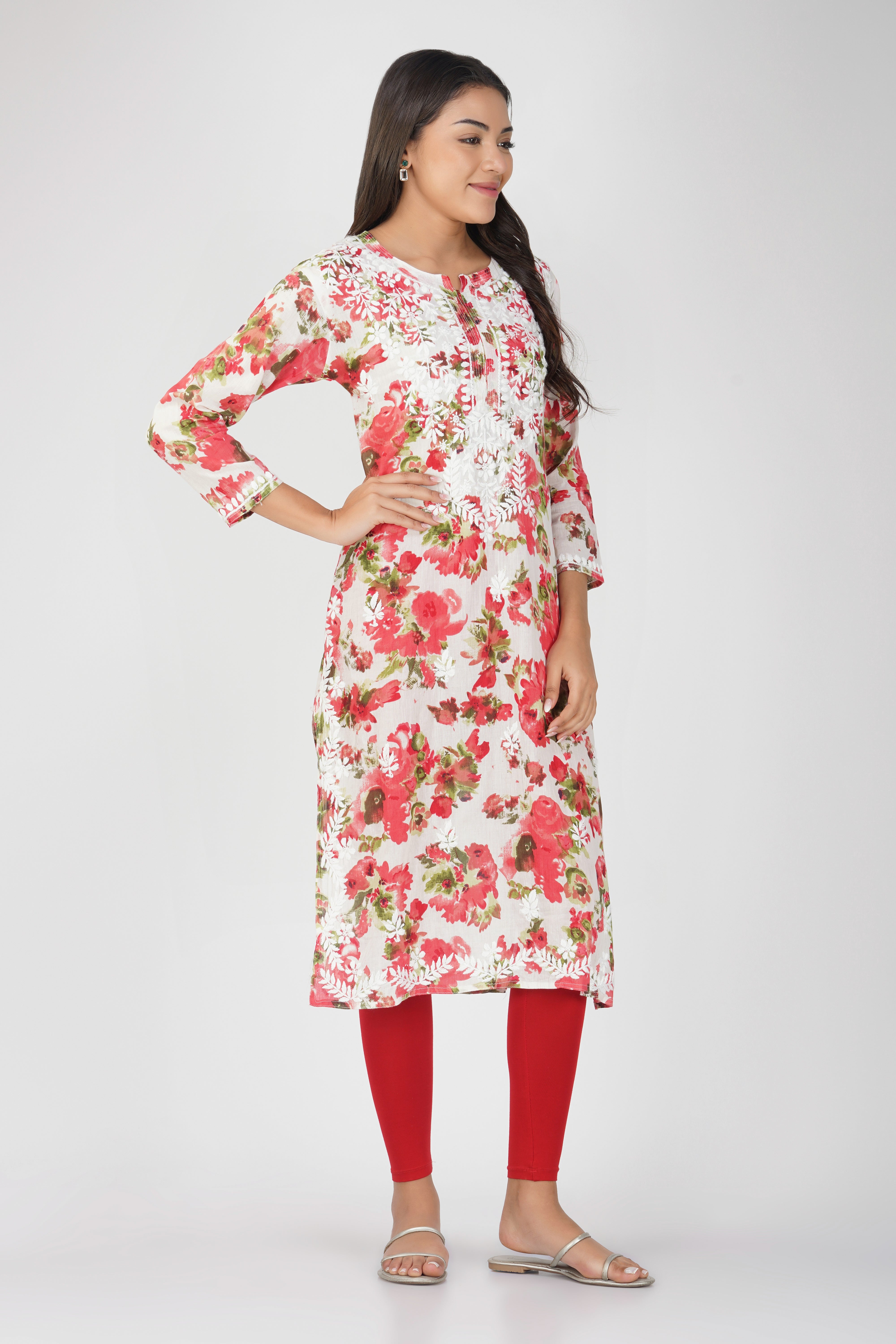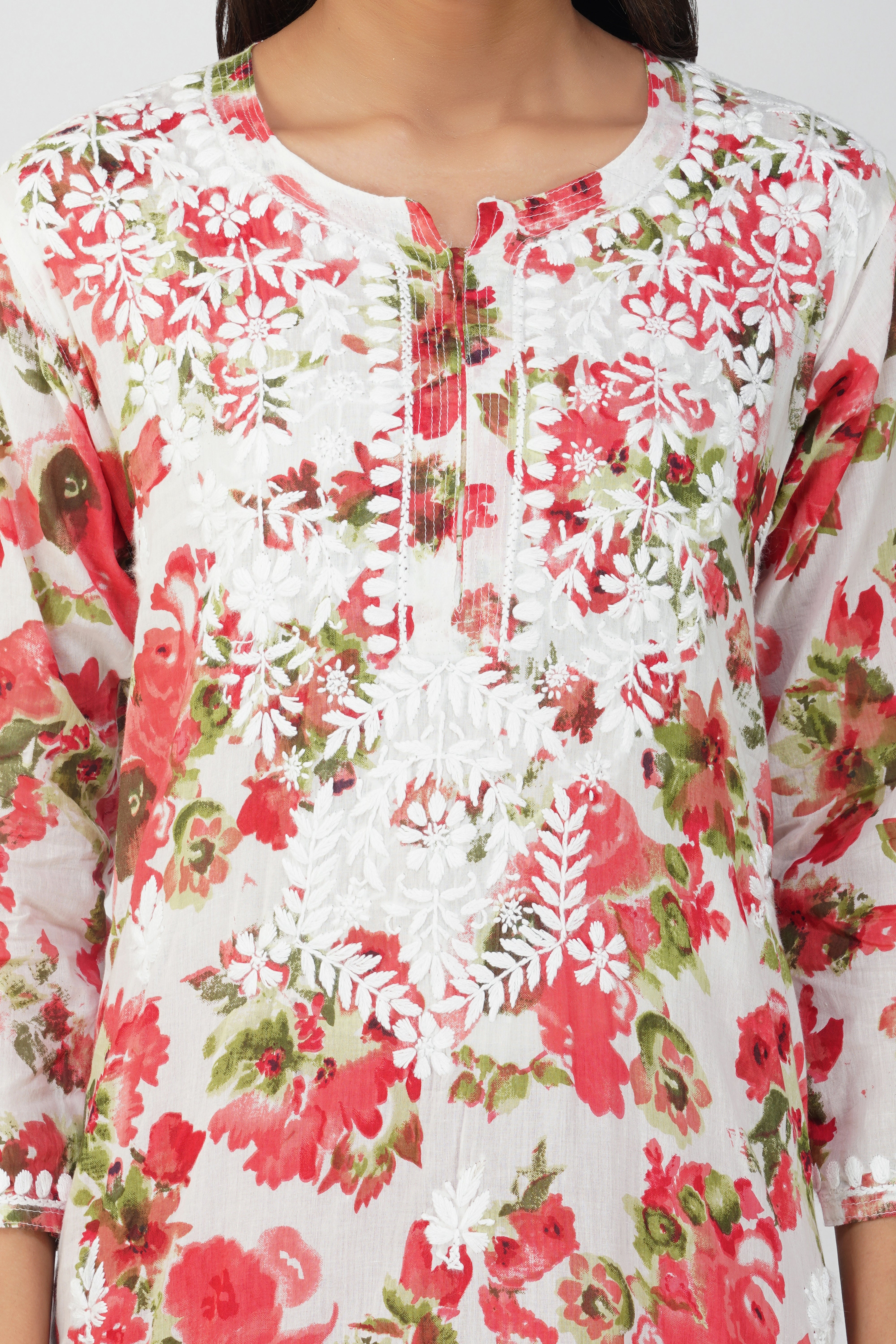 Flowery Red Cotton Kurti with White Chikankari Embroidery