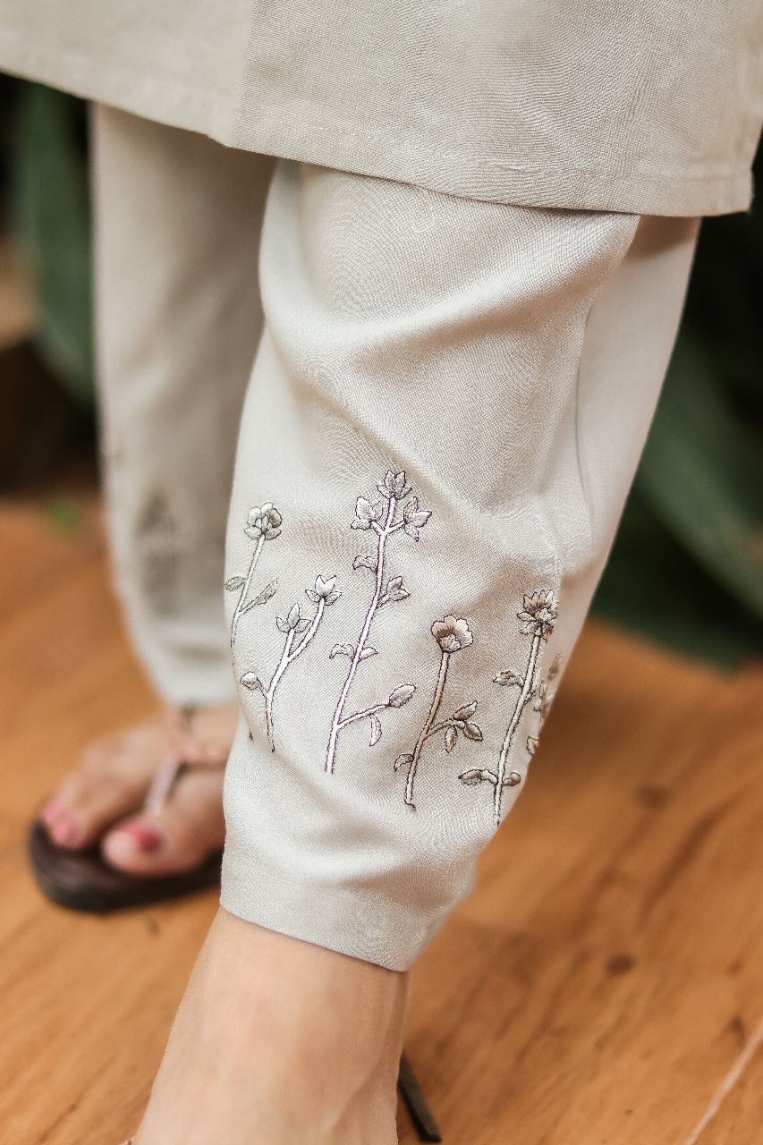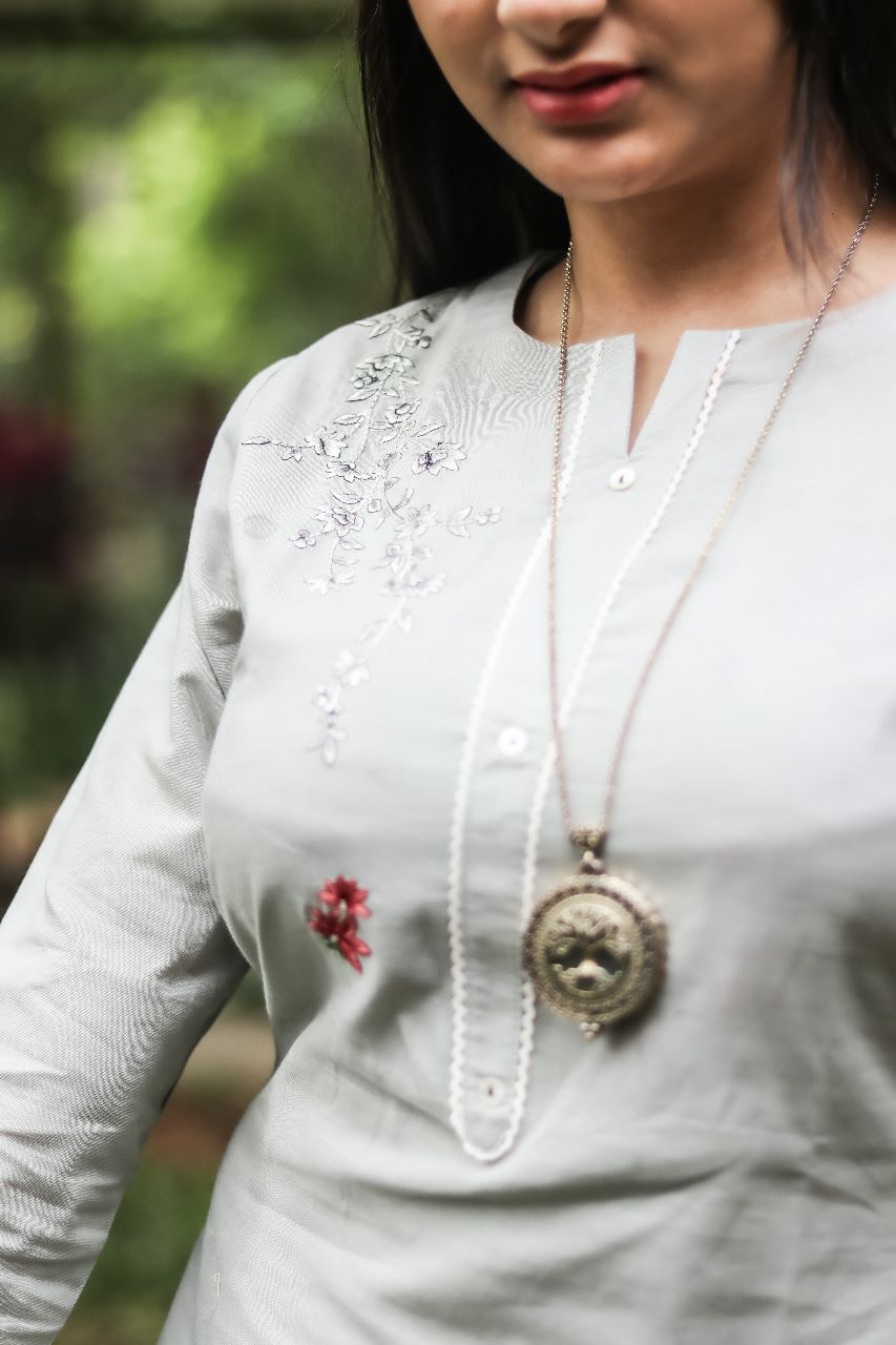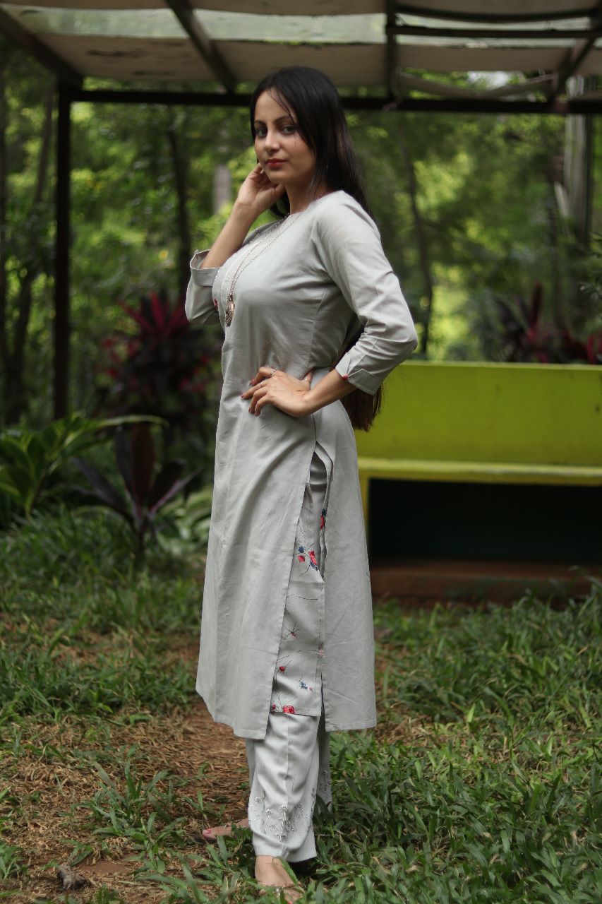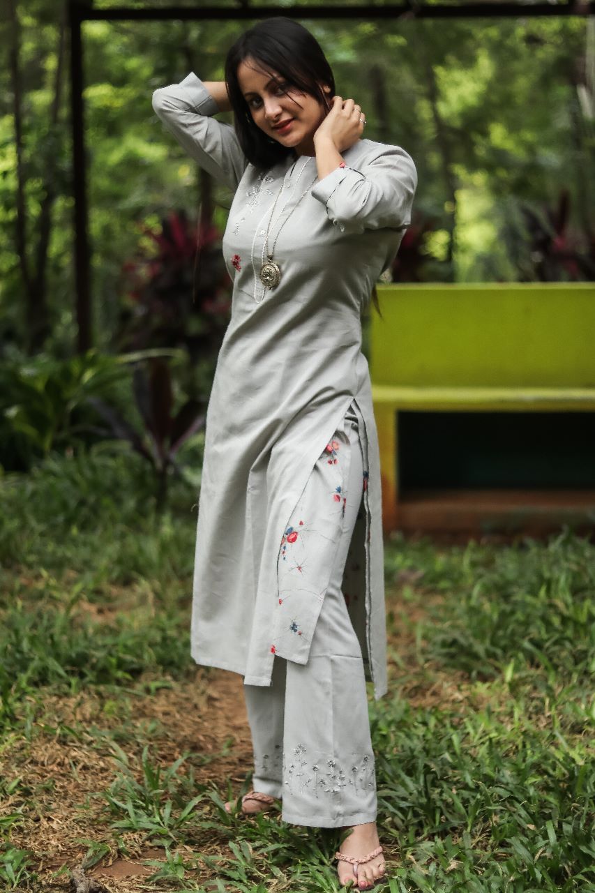 This is the most adorable piece of clothing one can ever set eyes on. Crafted with pretty machine embroidery on suit and palazzo and paired with a cotton stole, it is a mix of trendy style and everyday comfort. The machine embroidery detailing on the palazzo enhances its charm.