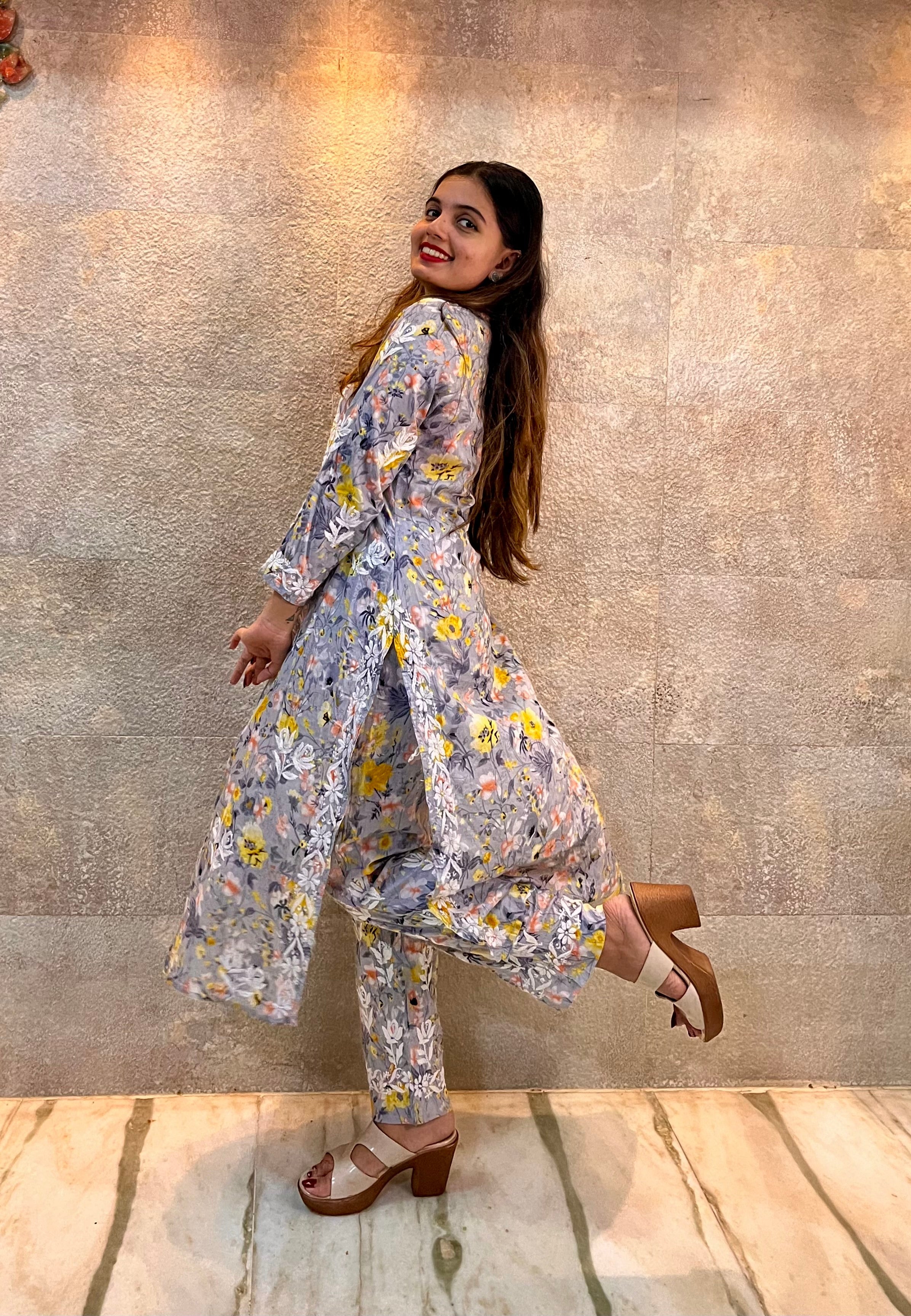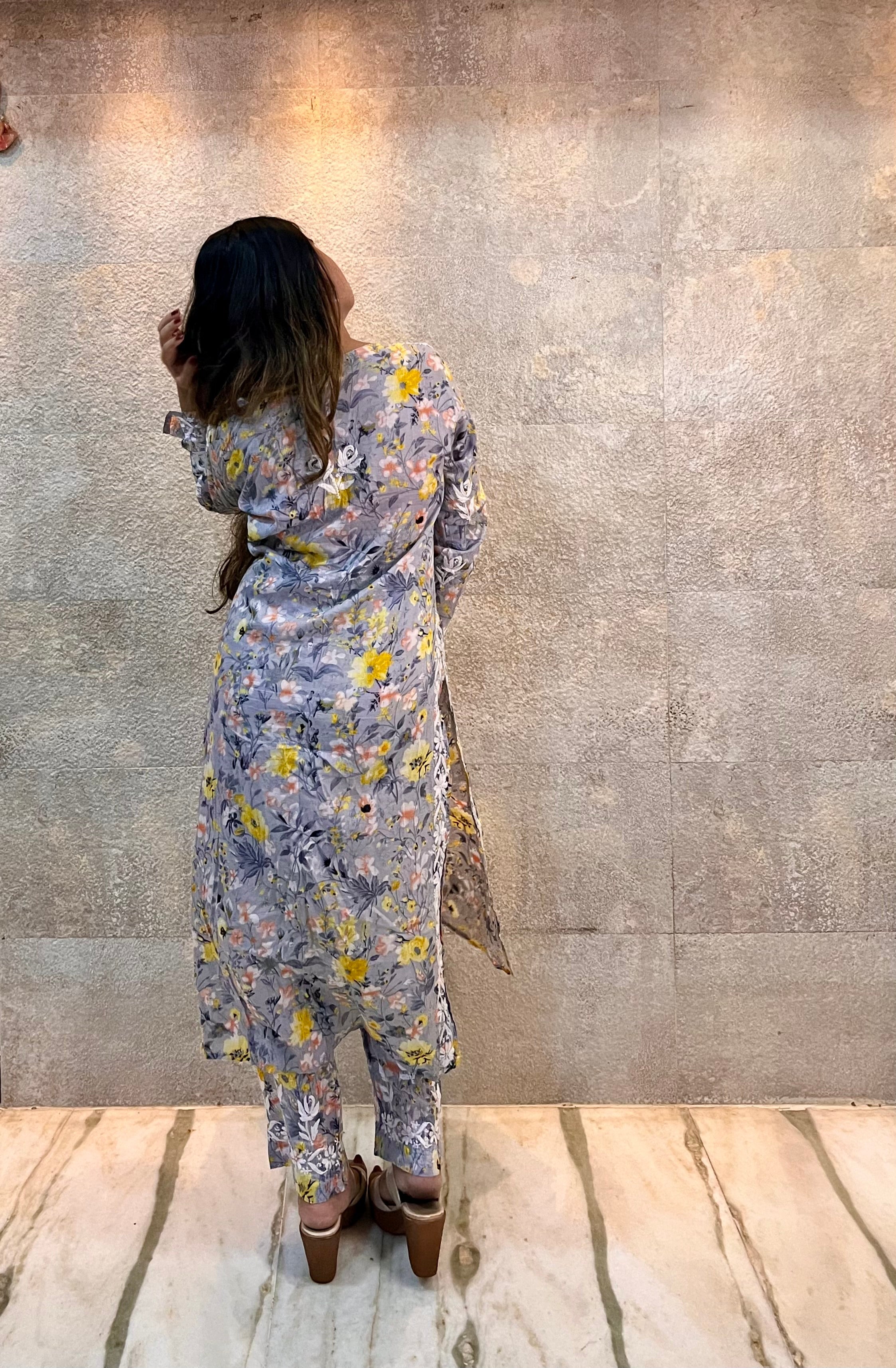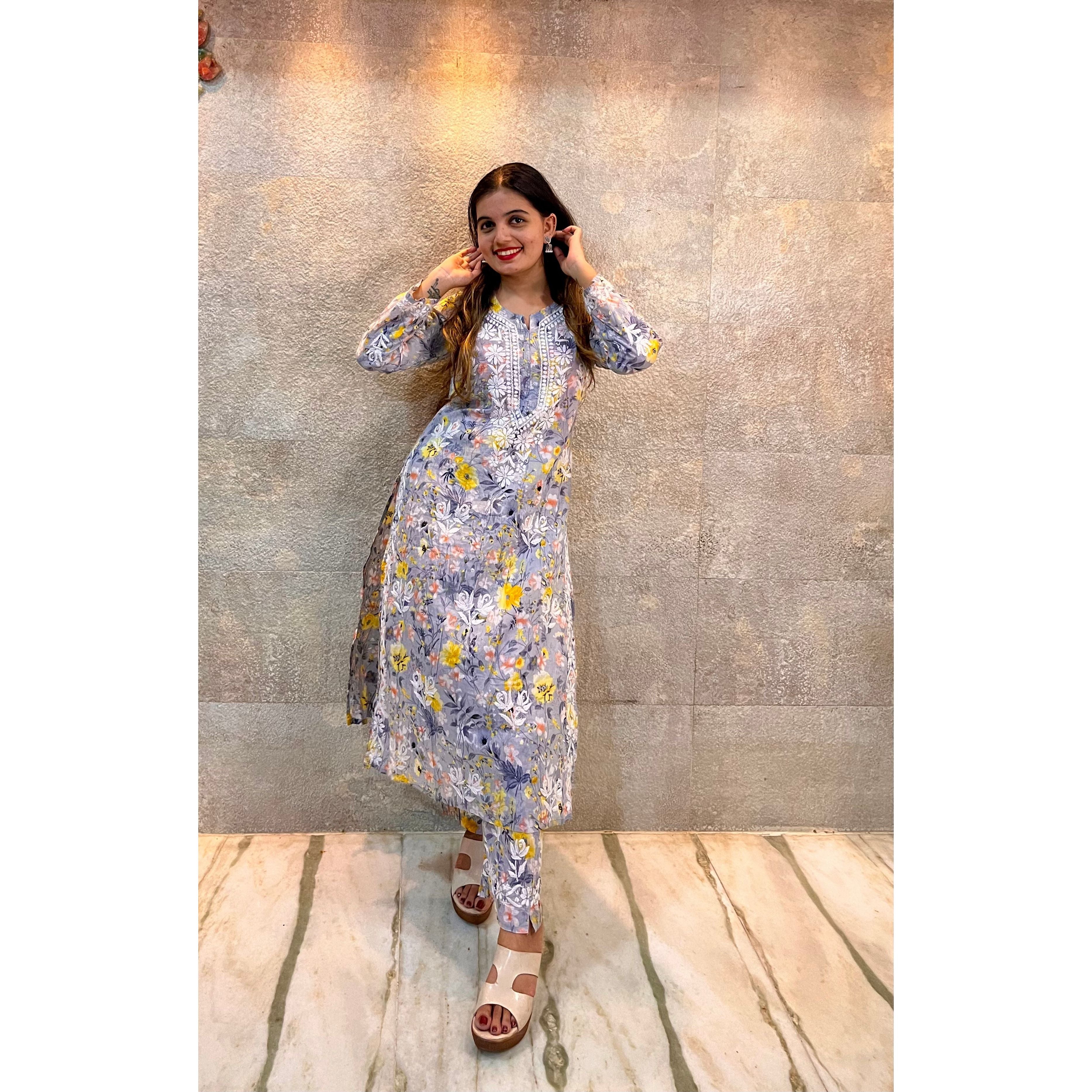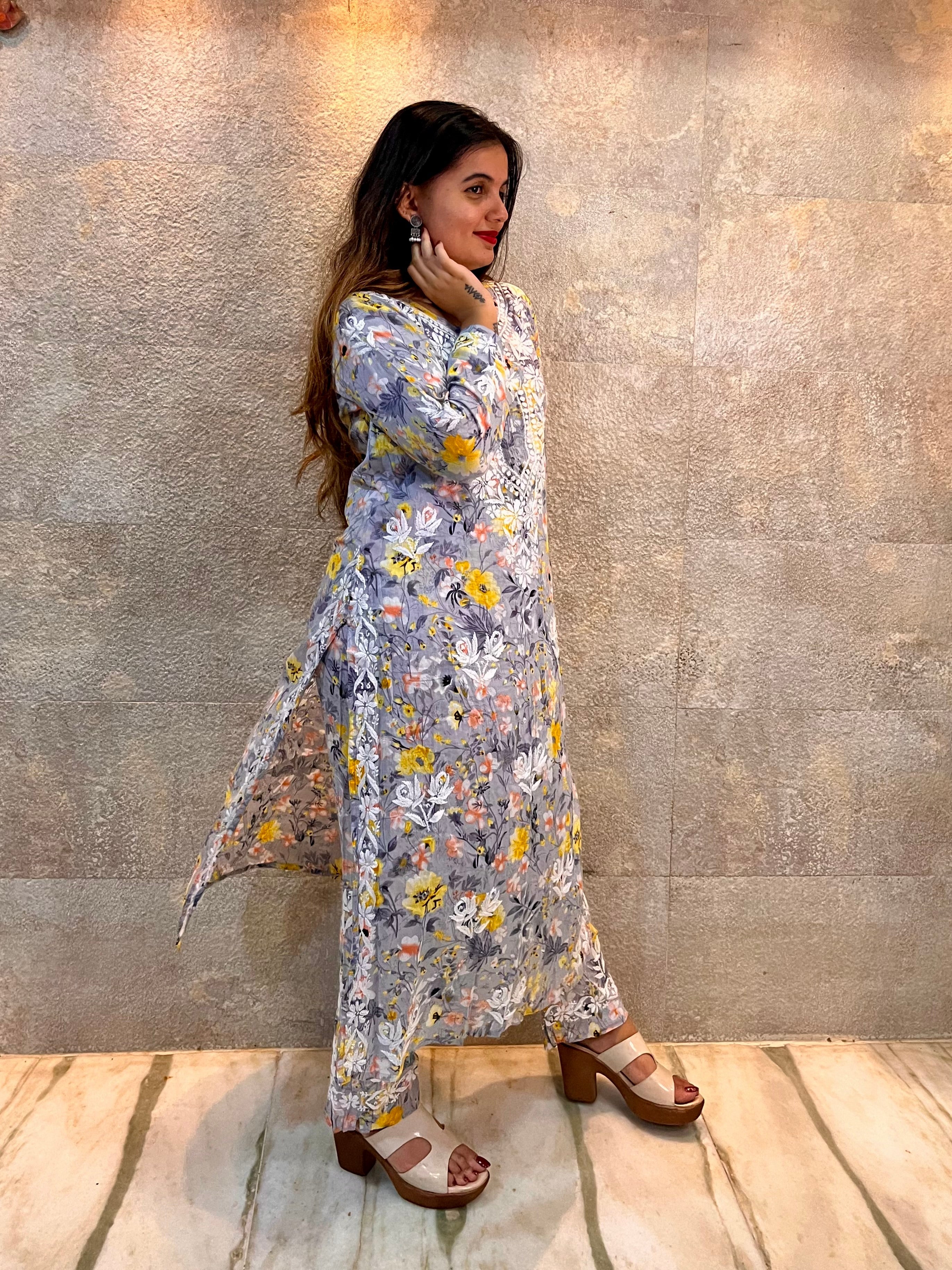 Grey Mulmul Yellow Floral Cotton Chikankari Kurti Set