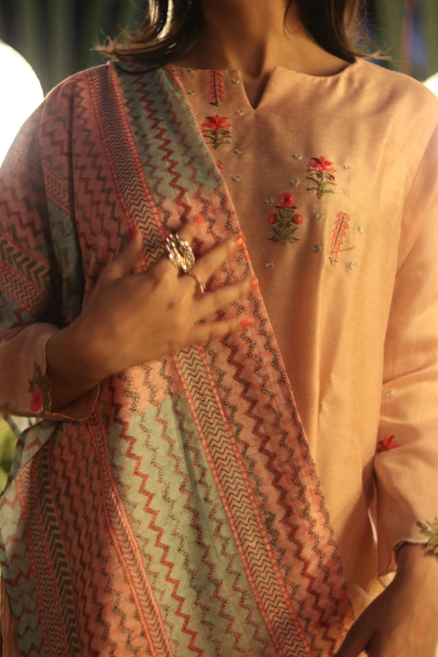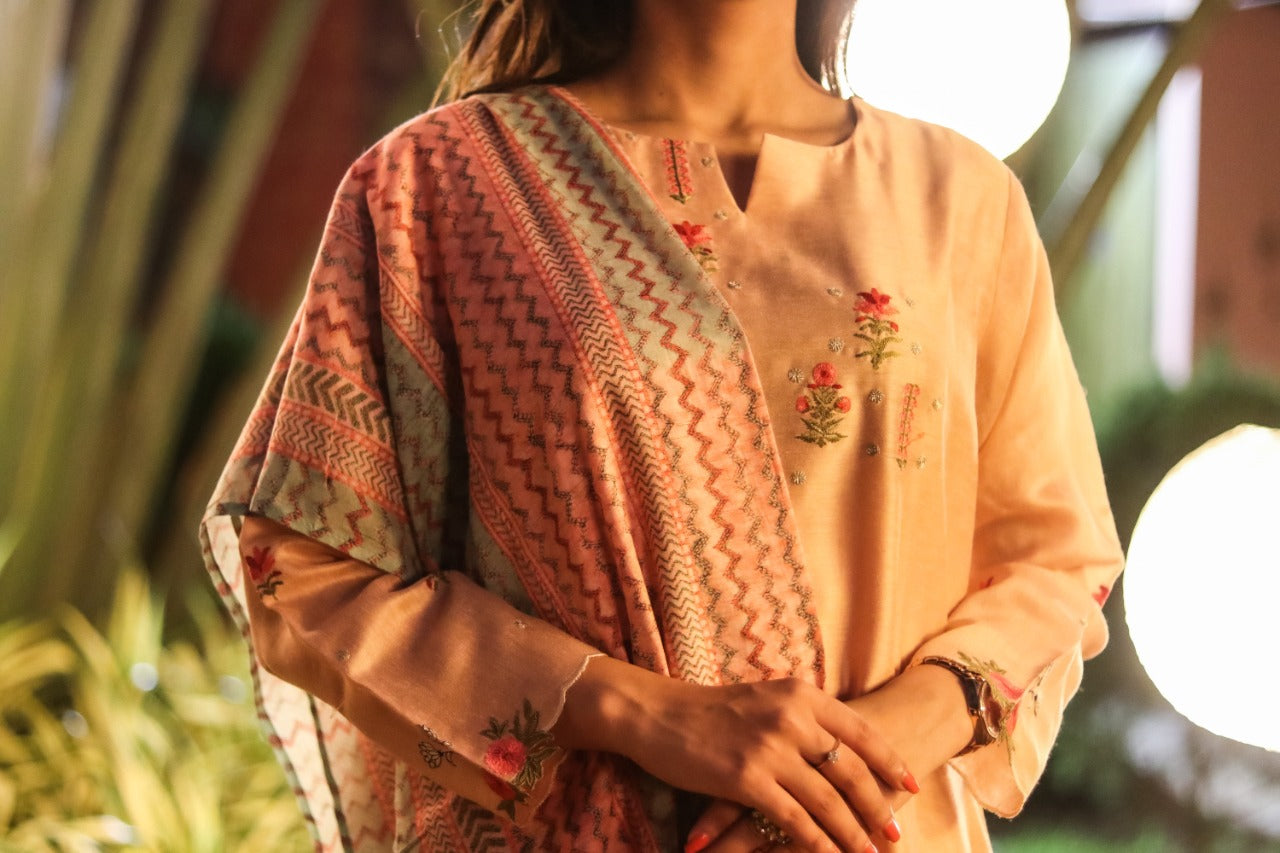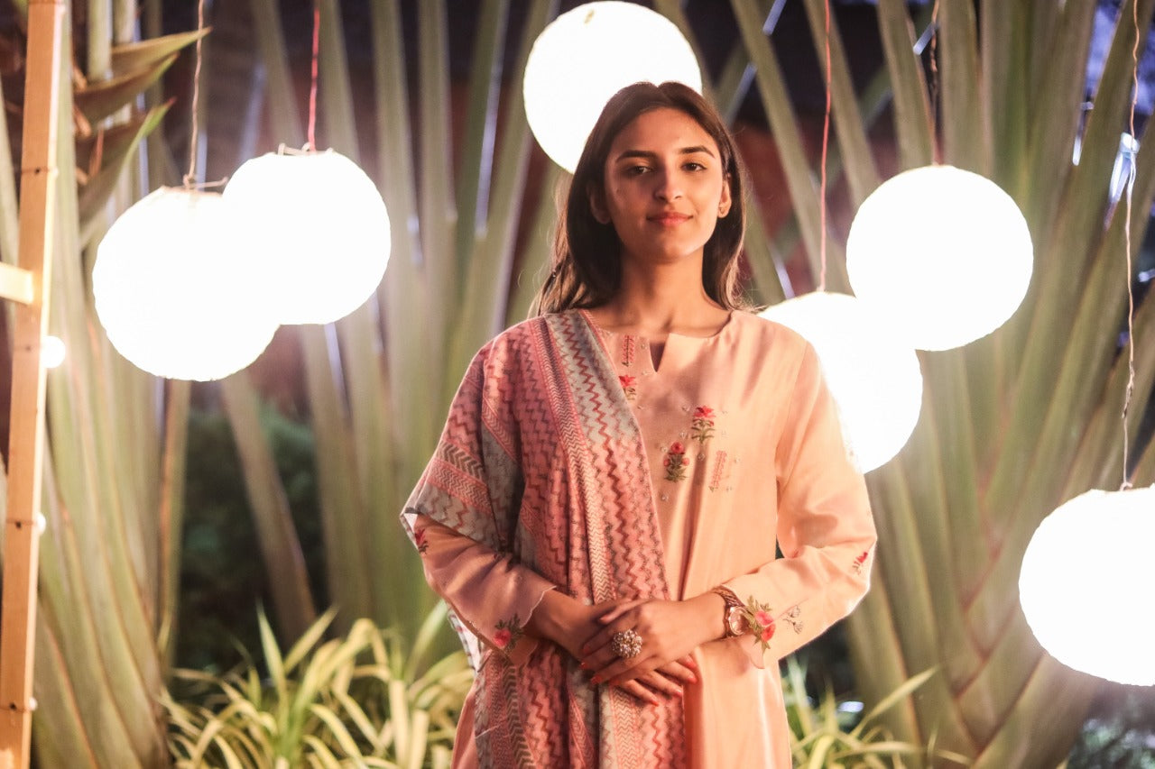 Tailored with fine detailing, our light Pink Suit Set will let you curate a smart look. With Silk Suit Set & Cotton Dupatta, this ensemble is a mesmerizing tale of art. Pair it with your favorite accessories and high heels to complete the look.