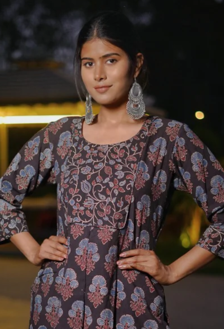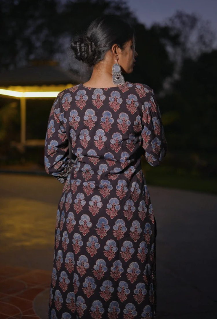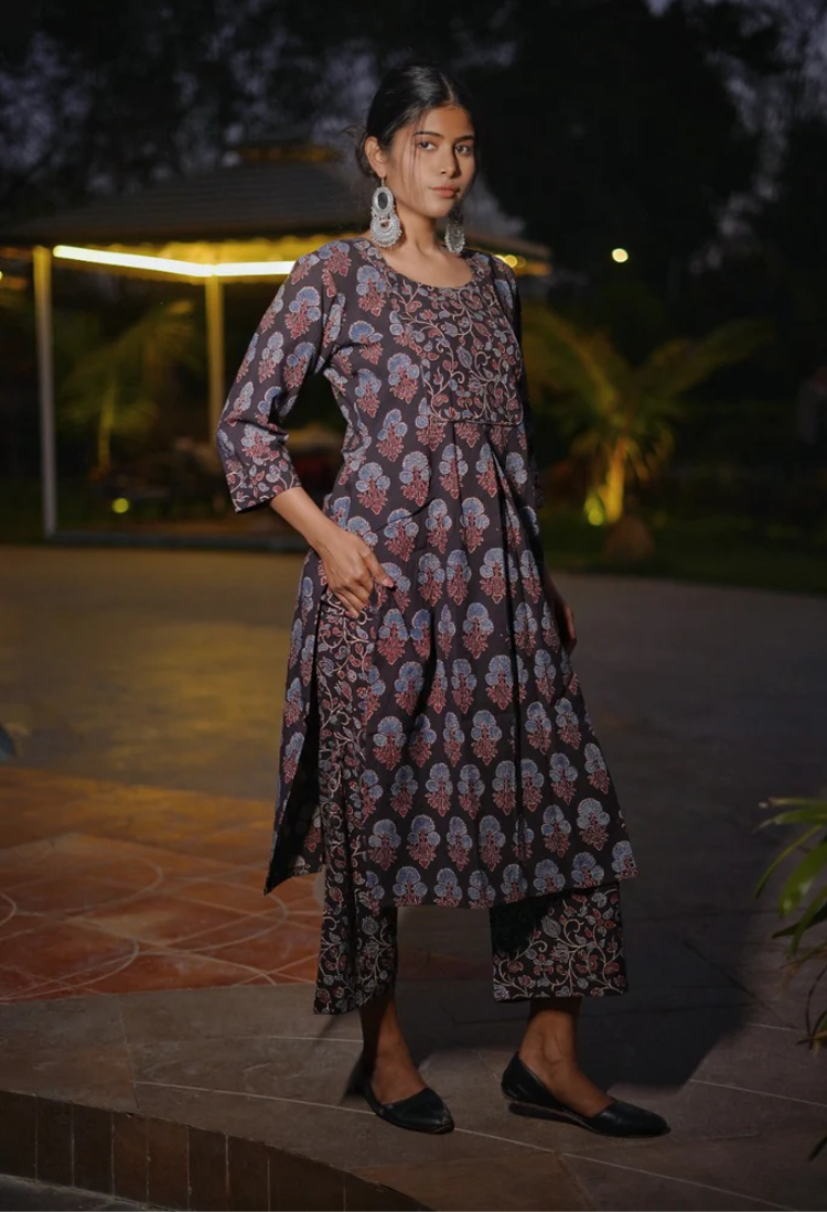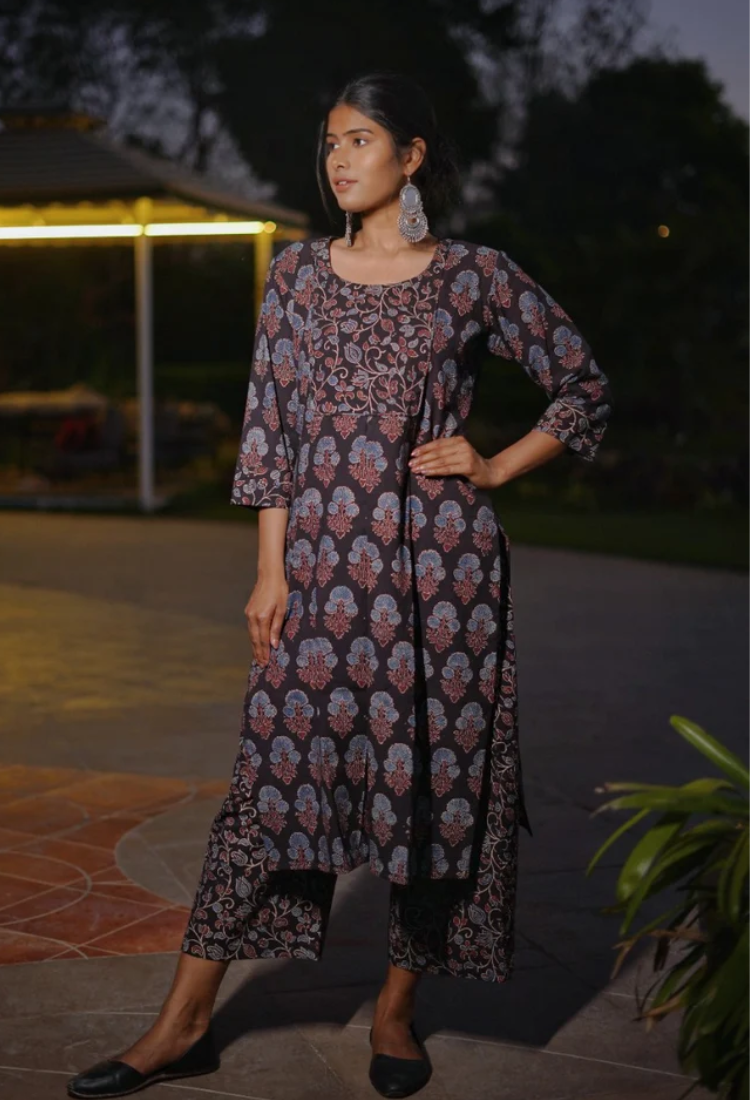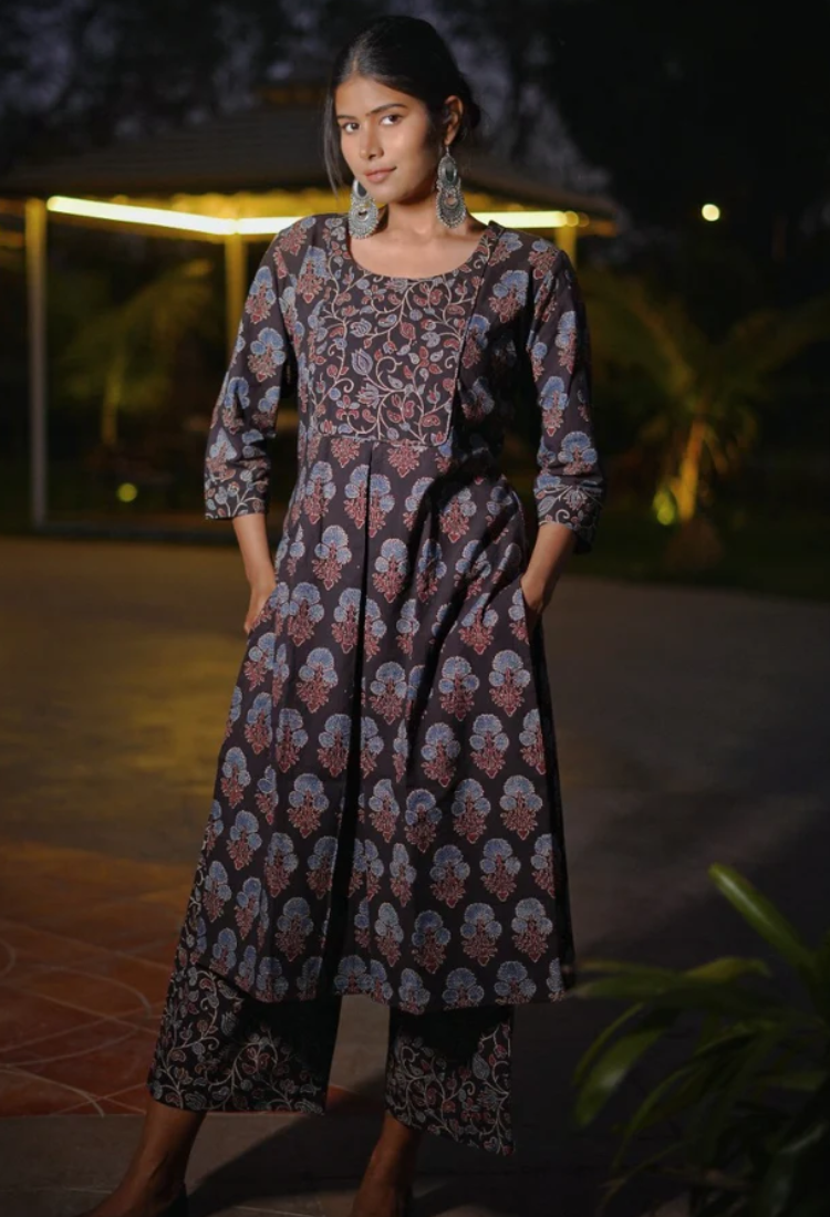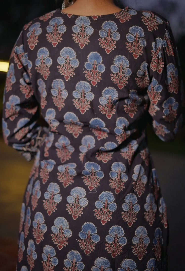 Ajrakh Hand-Block Printed Black Handloom Kurti Set