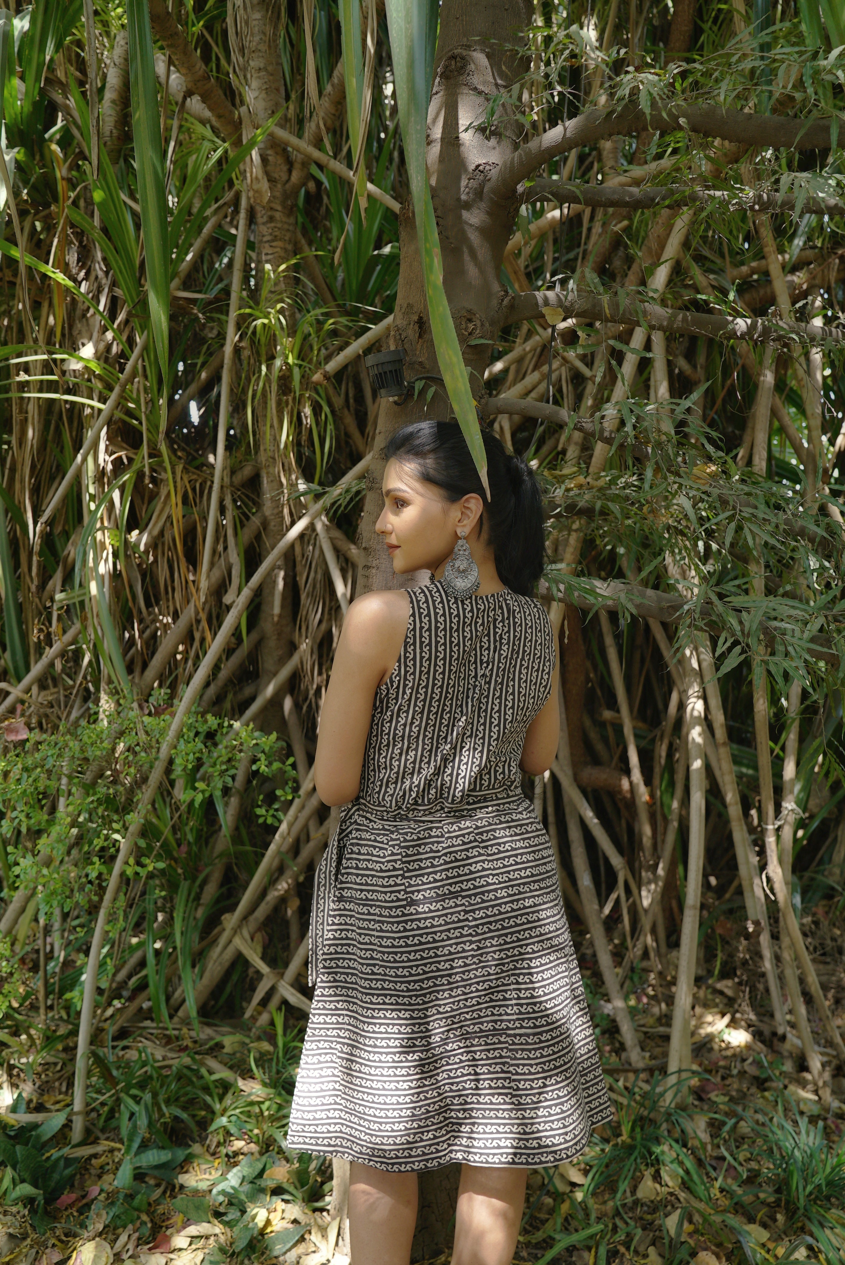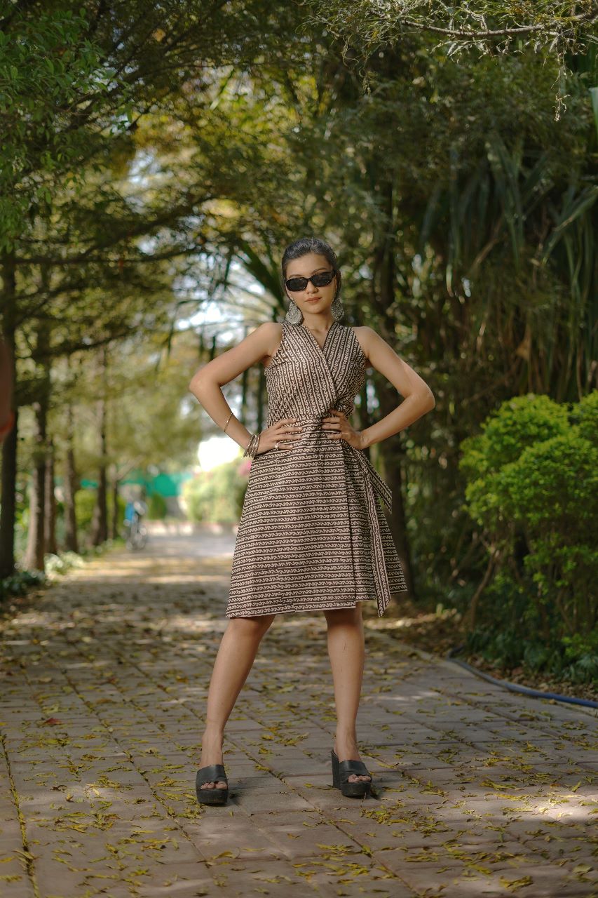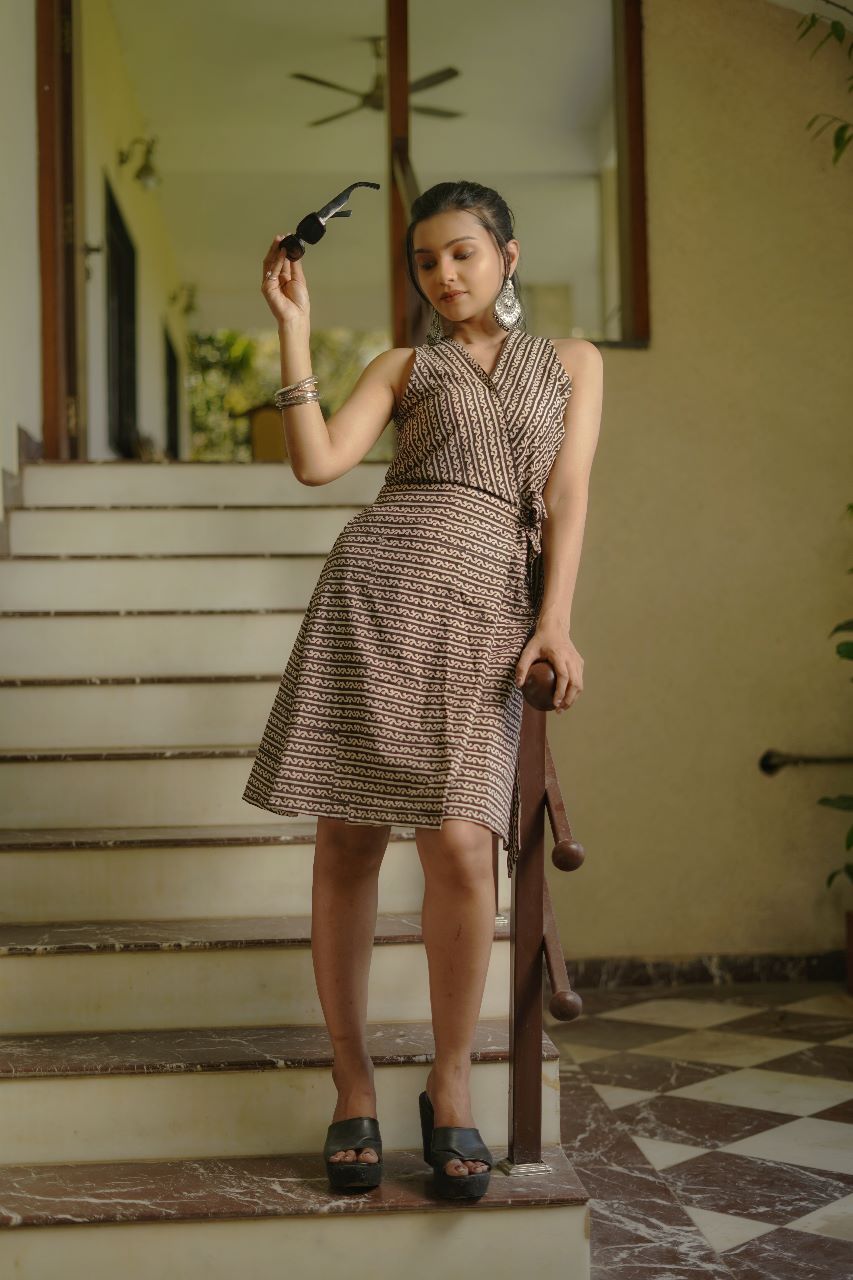 COTTON BLACK WRAP DRESS WITH BAGRU HAND-BLOCK PRINT