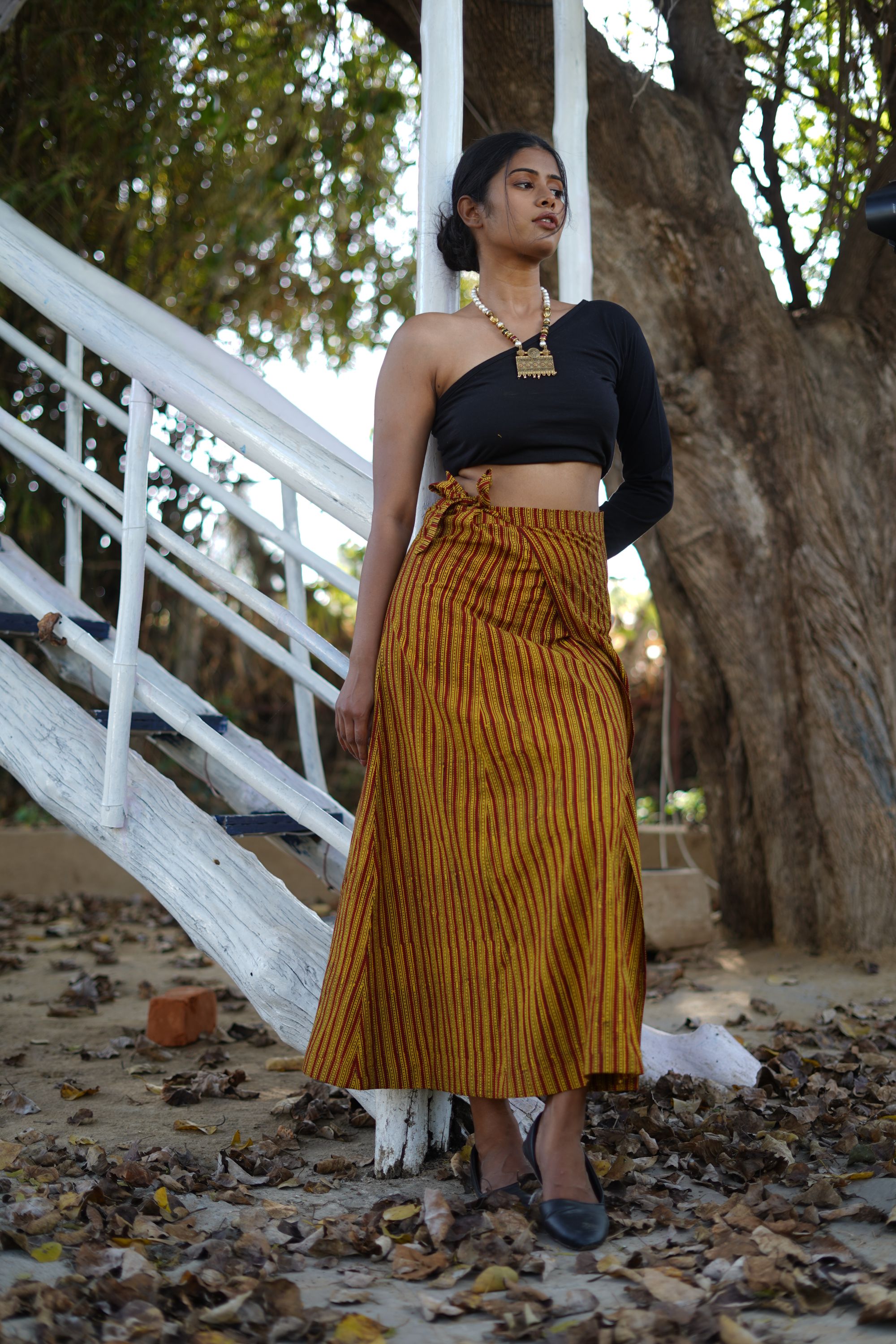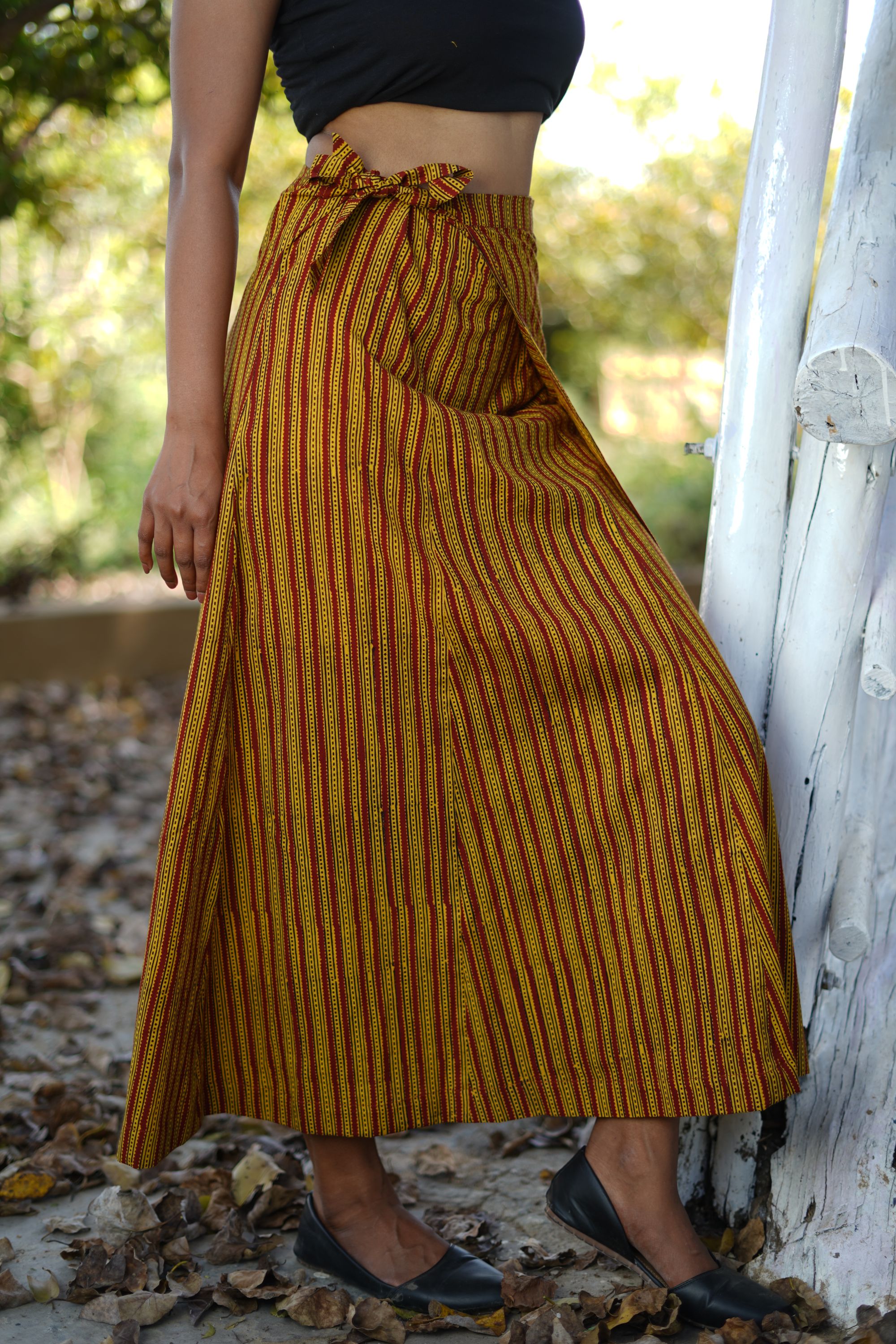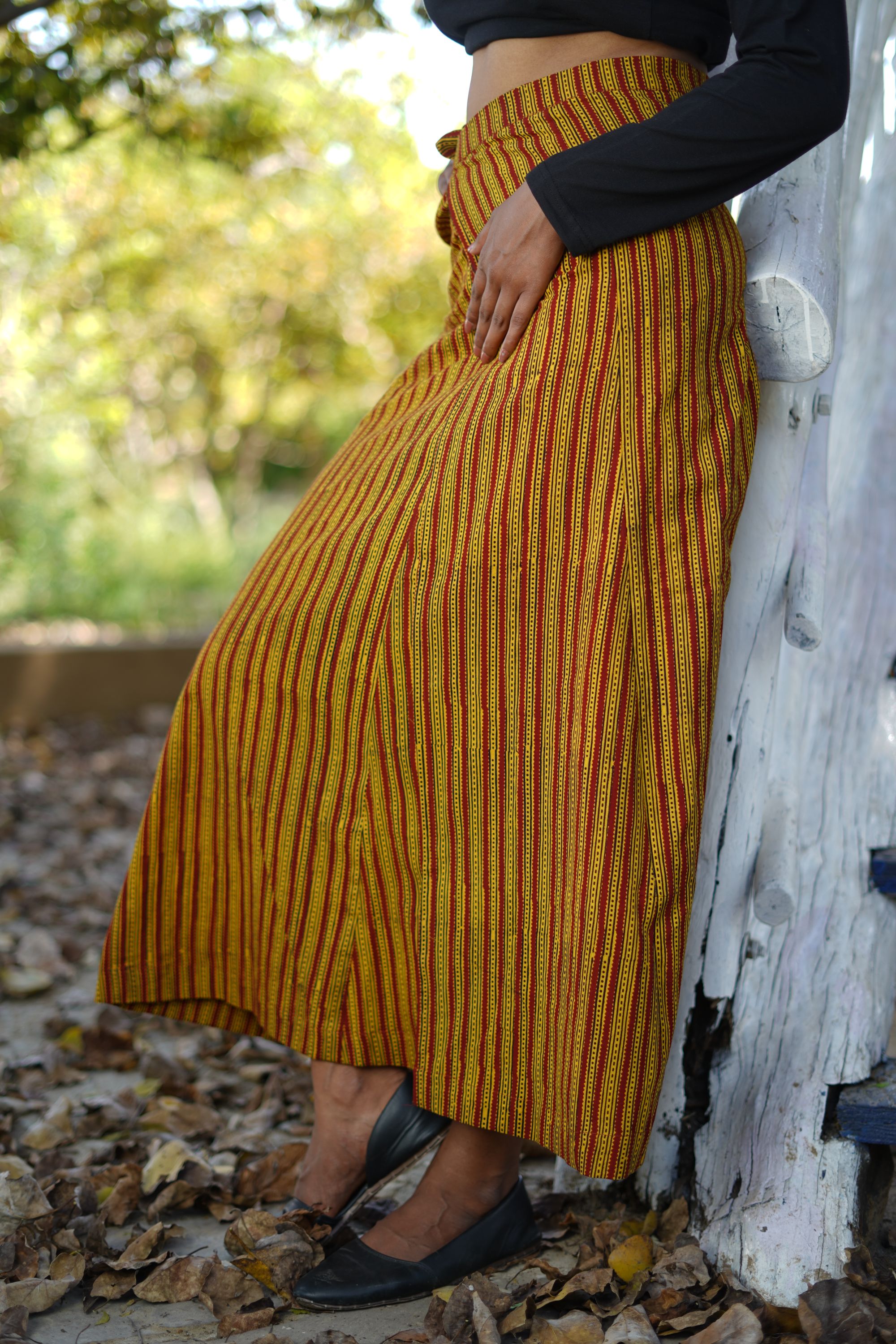 RED AND YELLOW COTTON HIGH WAIST SKIRT WITH BAGH HAND BLOCK PATTERN