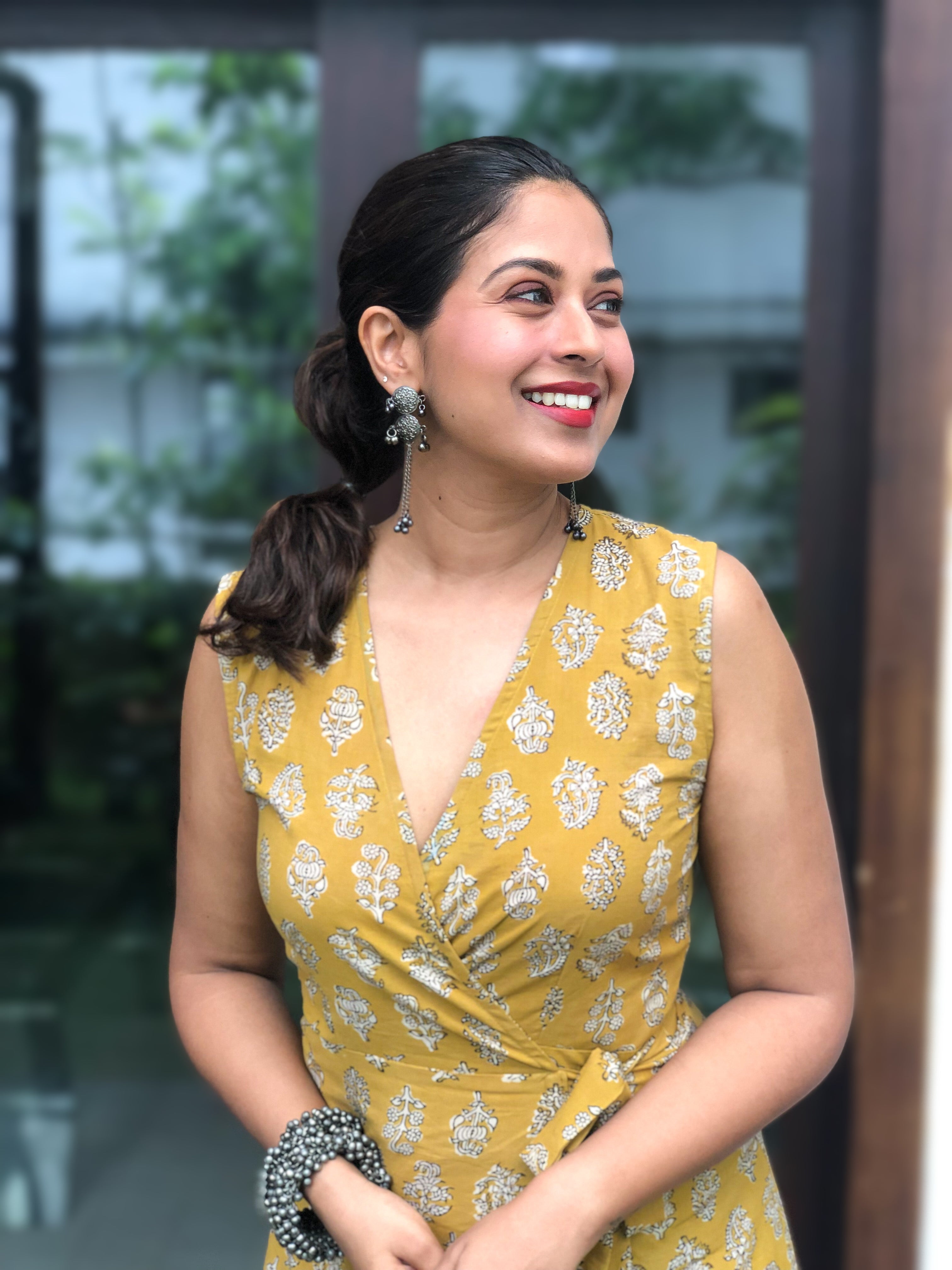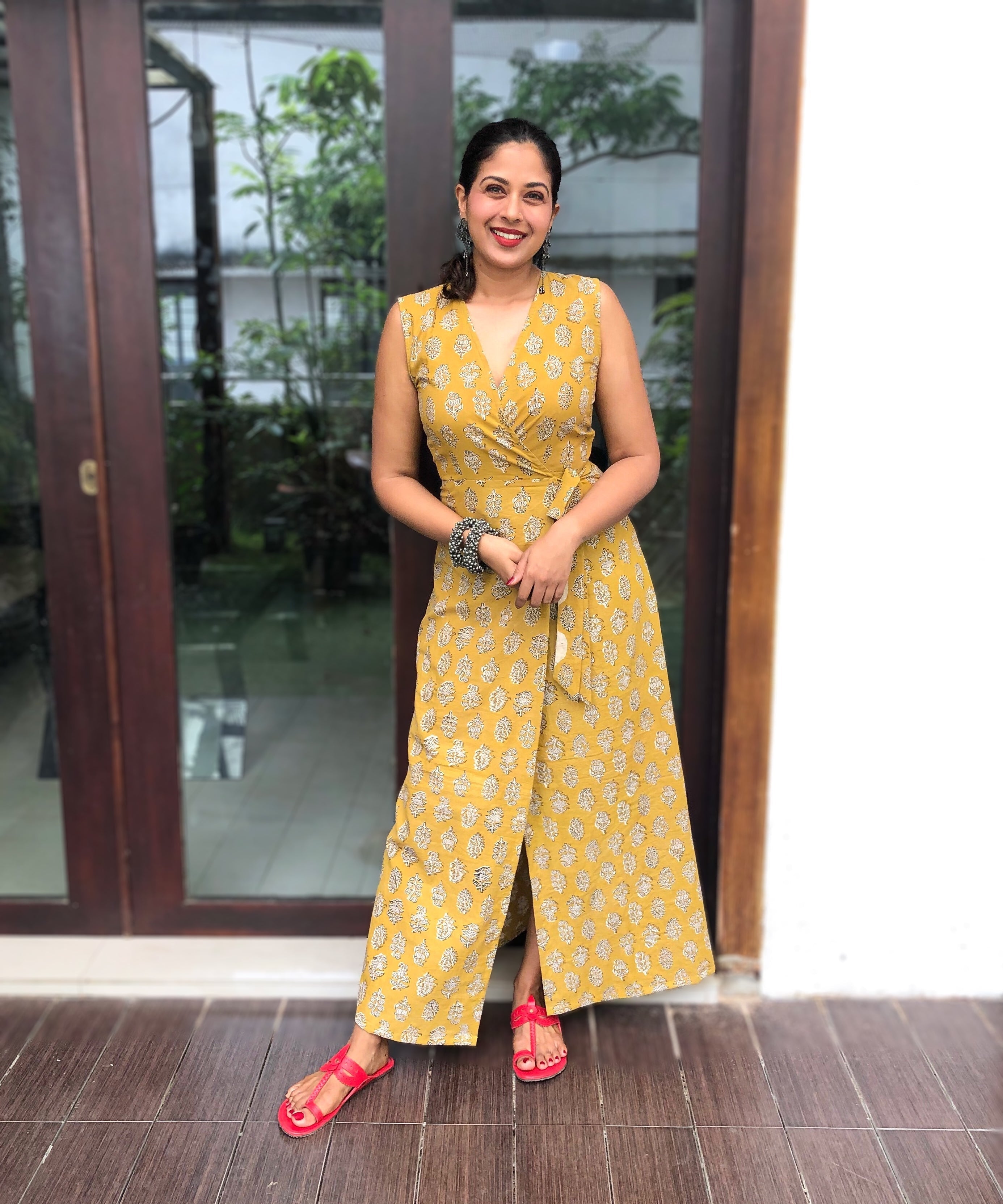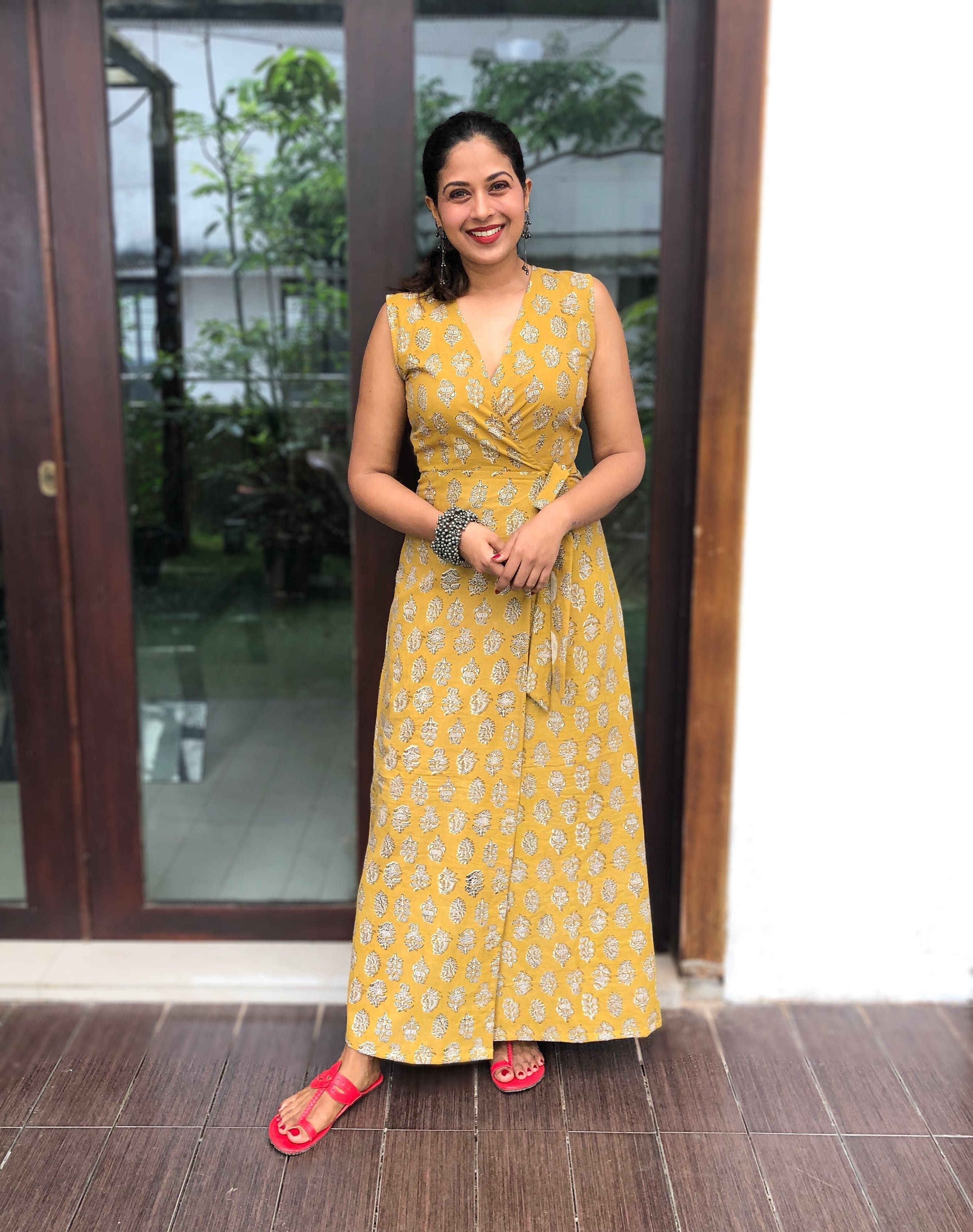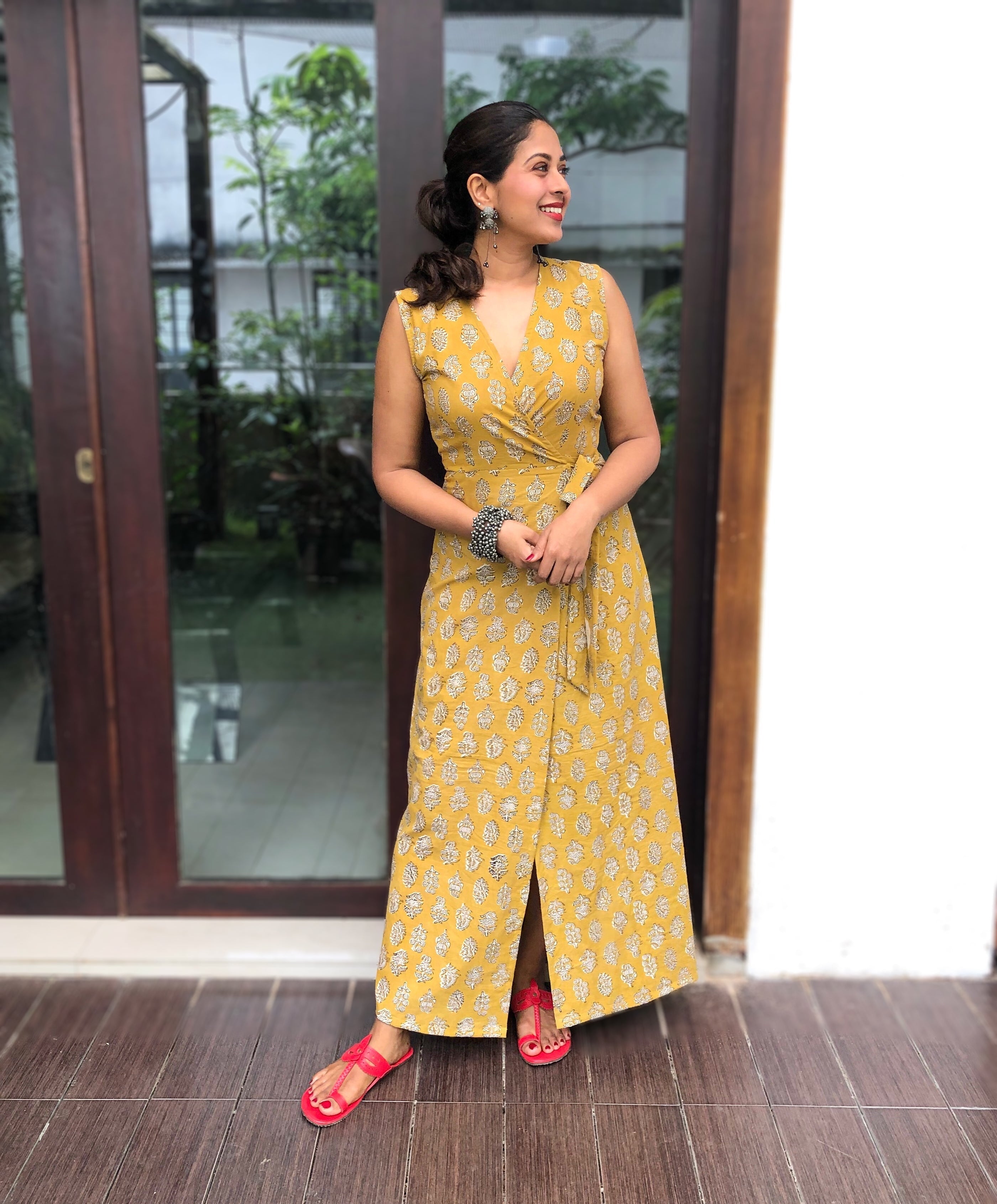 YELLOW COTTON DRESS WITH BAGHRU HAND-BLOCK PRINT