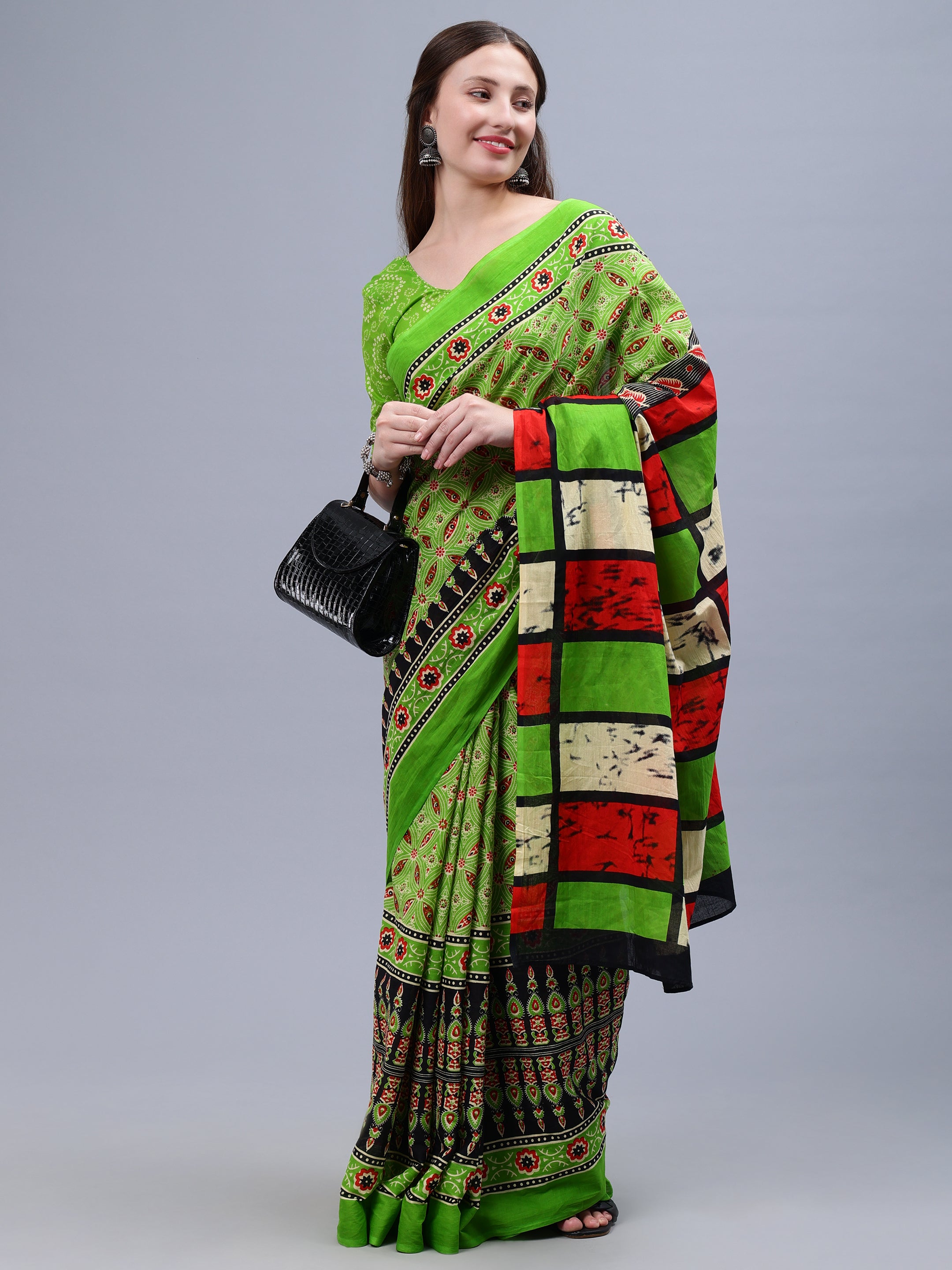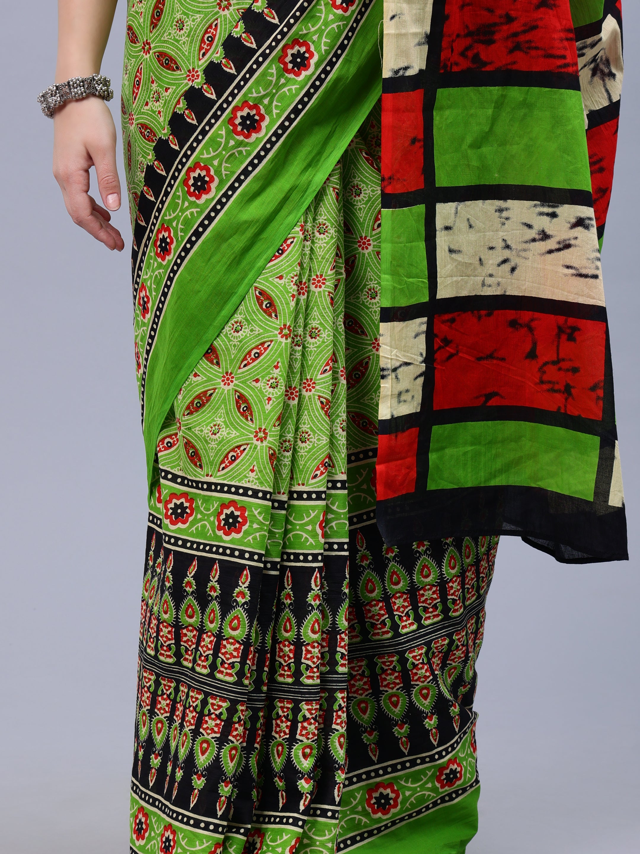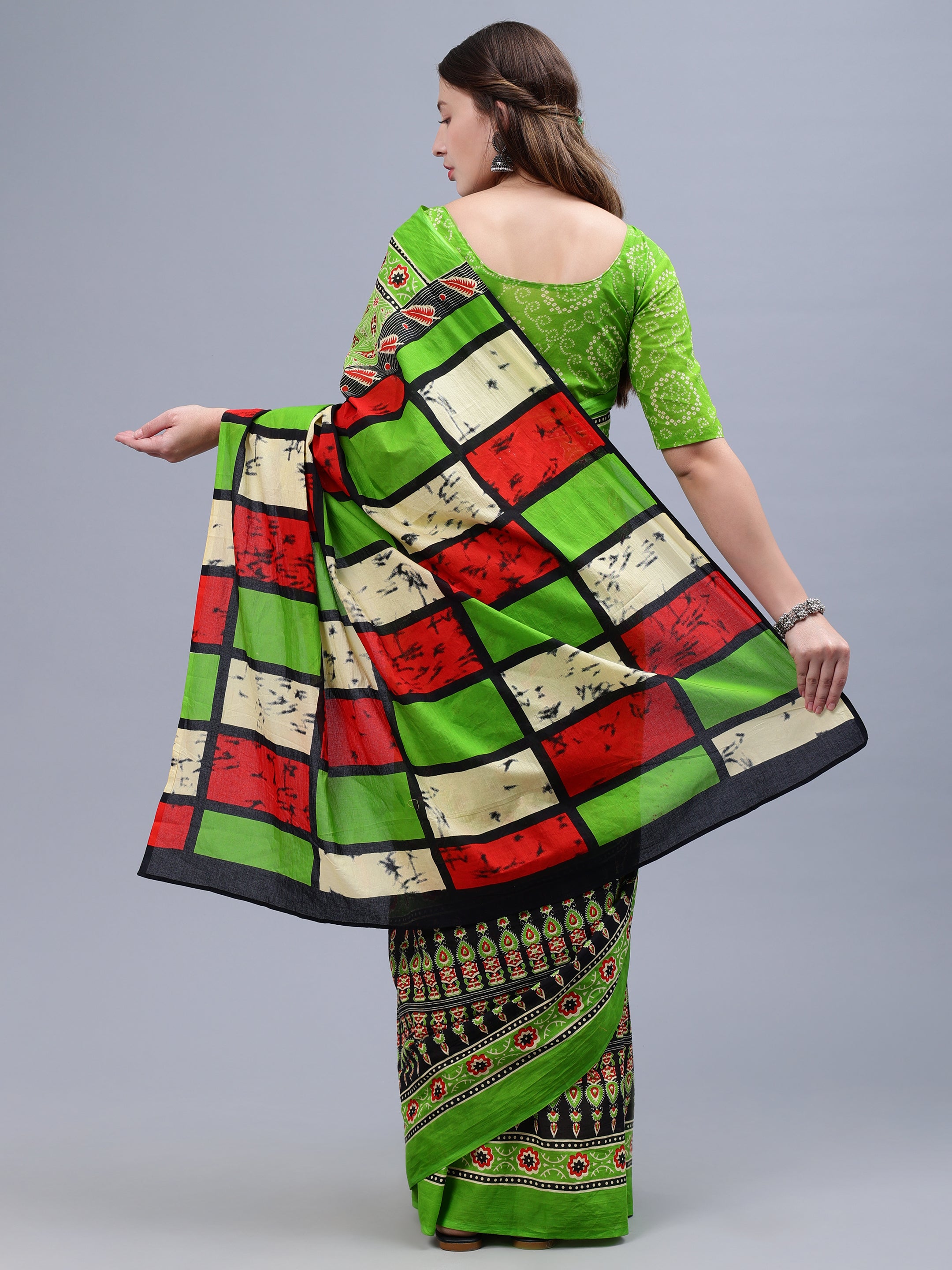Green Printed Malmal Cotton Saree